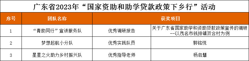 近日,《广东省教育厅关于公布2023年“国家资助和助学贷款政策下乡行”活动结果的通知》(粤教助函〔2023〕15号)的评选结果公示,伟德官网“青助同行”宣讲服务队获得“优秀调研报告”、梦想启航小分队成员郭铭悦获得“优秀实践队员”称号、星星之火助力乡村振兴队指导老师杨启慧获“优秀指导老师”称号。