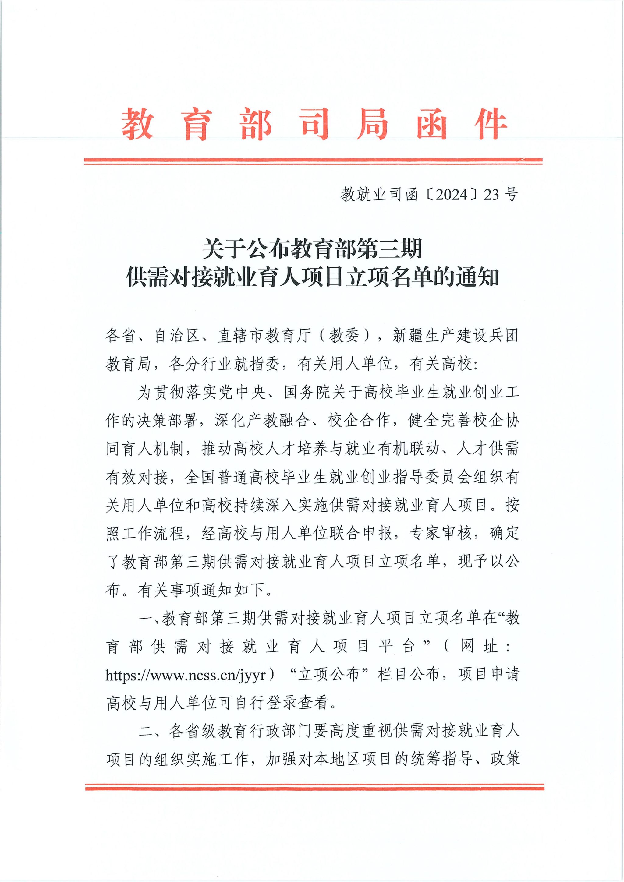 据悉,供需对接就业育人项目是教育部为贯彻落实党中央、国务院关于高校毕业生就业创业工作的决策部署,深化产教融合、校企合作,健全完善校企协同育人机制,推动高校人才培养与就业有机联动、人才供需有效对接的重要抓手。学校高度重视供需对接就业育人项目立项建设工作,出台《教育部供需对接就业育人项目管理办法(试行)》,从经费资助、成果认定、项目管理等方面保障供需对接就业育人项目的建设。