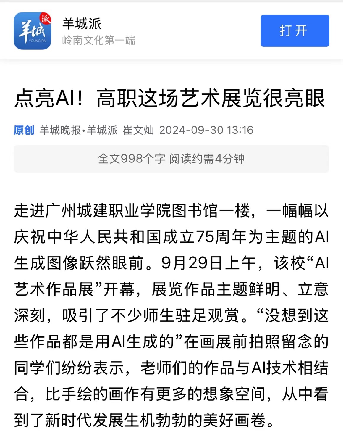 该校艺术与设计学院院长刘境奇表示,此次展览既是深情献礼新中国成立75周年,也是人工智能技术融入艺术创作的积极探索和生动诠释,为学校不断丰富新的教学形式,激发师生新的创意,提供了更加广阔的空间。