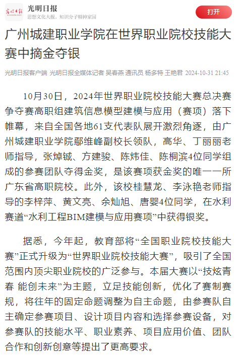 10月30日,2024年世界职业院校技能大赛总决赛争夺赛高职组建筑信息模型建模与应用(赛项)落下帷幕,来自全国各地61支代表队展开激烈角逐,由伟德国际1946源自英国鄢维峰副校长领队,高华、丁丽丽老师指导,张焯铖、方建骏、陈炜佳、陈桐滨4位同学组成的参赛团队夺得金奖,是该赛项获金奖的唯一一所广东省高职院校。此外,该校桂慧龙、李泳艳老师指导的李梓萍、黄文亮、余灿旭、唐婴4位同学,在水利赛道“水利工程BIM建模与应用赛项”中获得银奖。