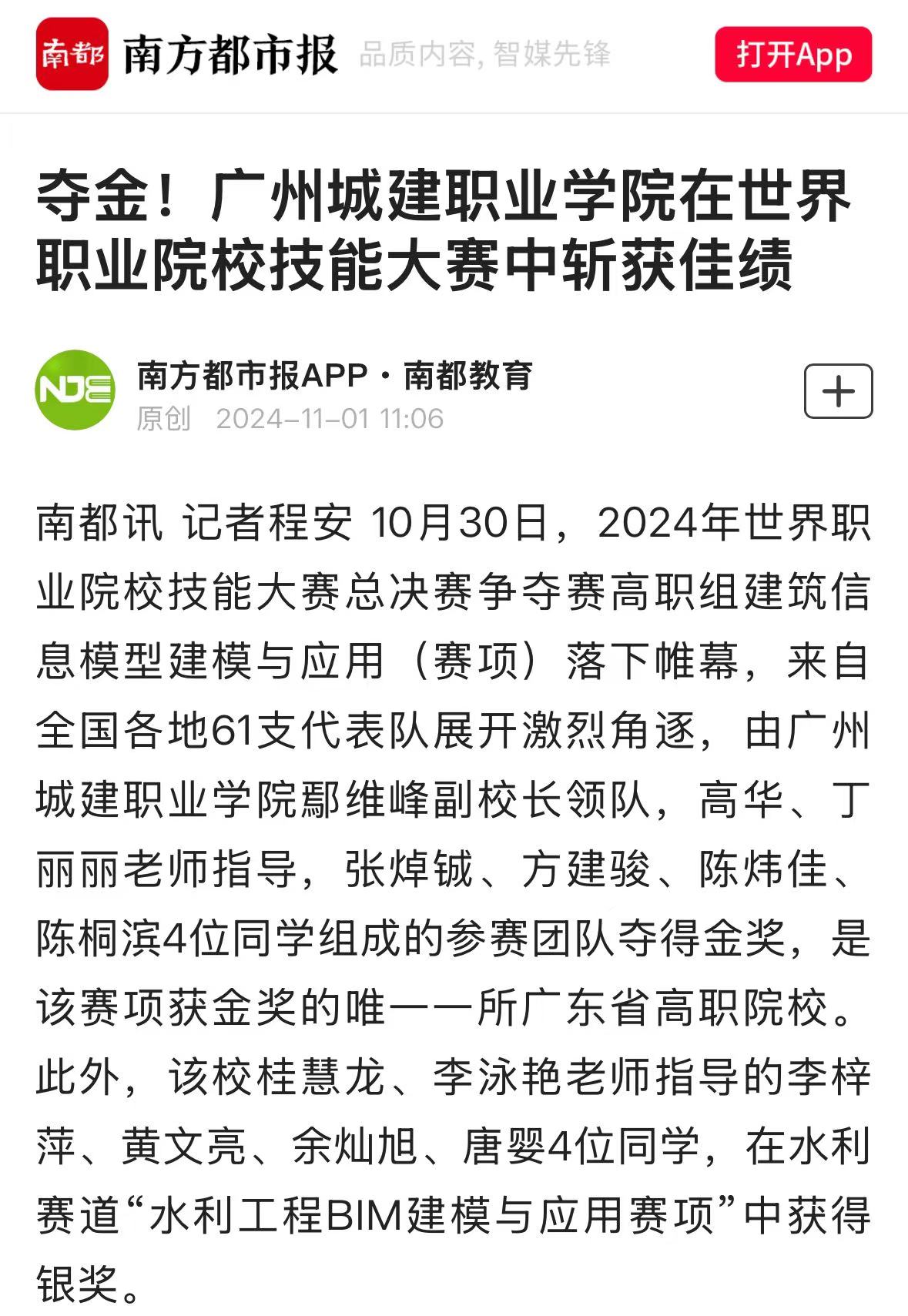 10月30日,2024年世界职业院校技能大赛总决赛争夺赛高职组建筑信息模型建模与应用(赛项)落下帷幕,来自全国各地61支代表队展开激烈角逐,由伟德国际1946源自英国鄢维峰副校长领队,高华、丁丽丽老师指导,张焯铖、方建骏、陈炜佳、陈桐滨4位同学组成的参赛团队夺得金奖,是该赛项获金奖的唯一一所广东省高职院校。此外,该校桂慧龙、李泳艳老师指导的李梓萍、黄文亮、余灿旭、唐婴4位同学,在水利赛道“水利工程BIM建模与应用赛项”中获得银奖。