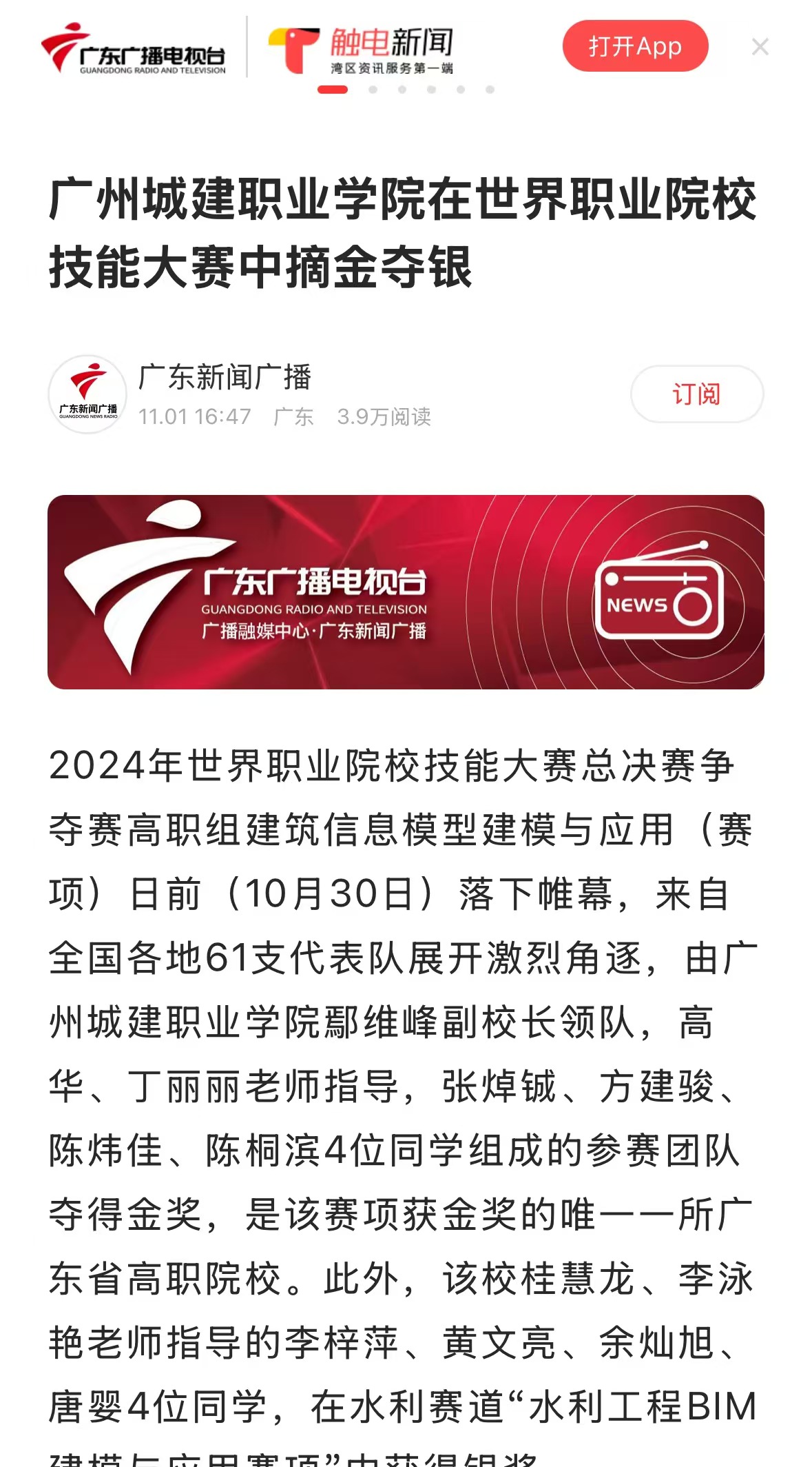 2024年世界职业院校技能大赛总决赛争夺赛高职组建筑信息模型建模与应用(赛项)日前(10月30日)落下帷幕,来自全国各地61支代表队展开激烈角逐,由伟德国际1946源自英国鄢维峰副校长领队,高华、丁丽丽老师指导,张焯铖、方建骏、陈炜佳、陈桐滨4位同学组成的参赛团队夺得金奖,是该赛项获金奖的唯一一所广东省高职院校。此外,该校桂慧龙、李泳艳老师指导的李梓萍、黄文亮、余灿旭、唐婴4位同学,在水利赛道“水利工程BIM建模与应用赛项”中获得银奖。