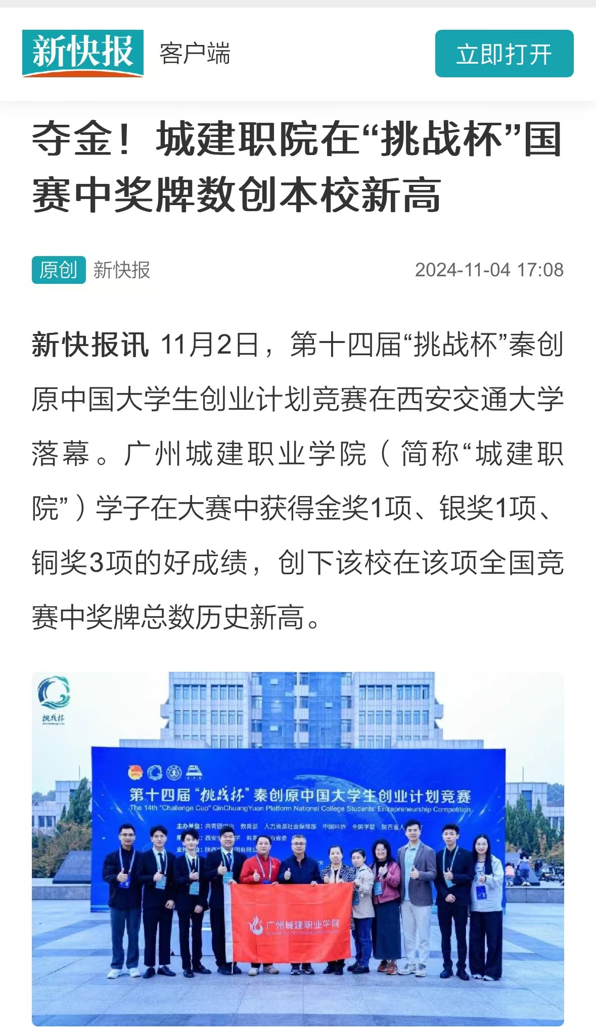 据介绍,截至目前,城建职院已获“挑战杯”中国大学生创业计划竞赛国赛金奖2项、银奖2项、铜奖3项,省赛金奖7项。相关负责人表示,“后续,学校将不断促进创新创业教育与区域经济发展紧密结合,以项目为载体,着力提升学生的创新能力和实践操作能力,积极营造敢想敢闯的创新创业氛围,致力于培养具有战略眼光、创新精神、社会责任感的高素质技术技能人才,为广东省现代化建设输送更多双创尖兵。”