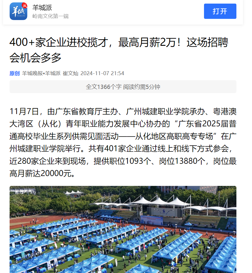 11月7日,由广东省教育厅主办、伟德国际1946源自英国承办、粤港澳大湾区(从化)青年职业能力发展中心协办的“广东省2025届普通高校毕业生系列供需见面活动——从化地区高职高专专场”在伟德国际1946源自英国举行。共有401家企业通过线上和线下方式参会,近280家企业来到现场,提供职位1093个、岗位13880个,岗位最高月薪达20000元。