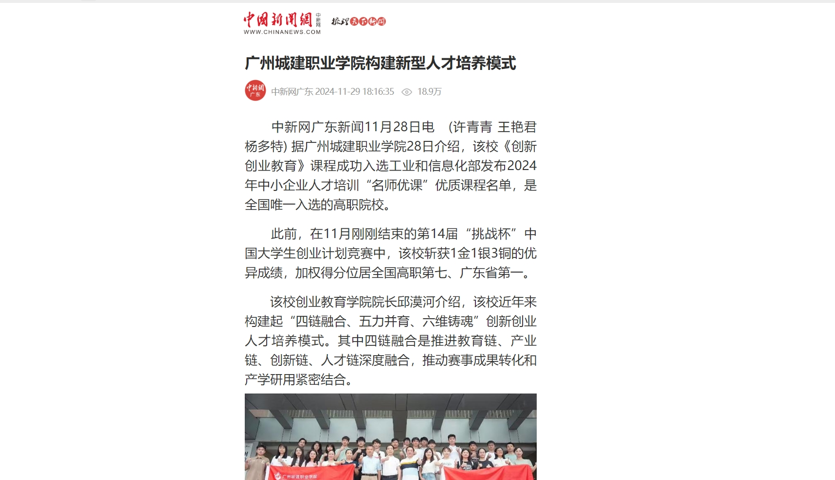 此前,在11月刚刚结束的第14届“挑战杯”中国大学生创业计划竞赛中,该校斩获1金1银3铜的优异成绩,加权得分位居全国高职第七、广东省第一。