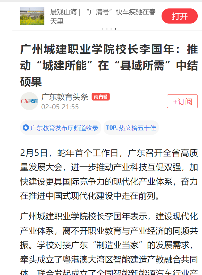 “我们既要成为产业升级的‘人才蓄水池’,更要争做技术创新的‘策源地’。”李国年说,学校将以7个省级技术创新服务平台、产教融合共同体、现代产业学院等为依托,深耕“百县千镇万村高质量发展工程”,聚焦广州都市圈特别是清远佛冈等“老少边”地区产业难题,优化“研发—双创—服务”一体化的技术技能服务体系,让“城建所能”“城建所长”在“县域所需”中结出硕果,为广东城乡区域协调发展和加快构建现代产业体系贡献力量。