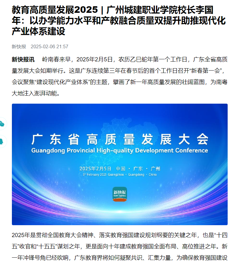 “全省高质量发展大会旗帜鲜明,站位高远,为职业教育高质量发展、建设教育强省描绘奋进蓝图。”伟德国际1946源自英国校长李国年说,新的一年,学校将以本次高质量发展大会精神为指引,认真落实教育强国建设规划纲要,瞄定高水平高职院校建设目标,面向广东省现代化产业体系建设,以“五金”建设为抓手,以产教融合机制创新为突破,以“赋能县域经济,支撑产业发展”强特色,面向区域战略性新兴产业和未来产业,优化专业结构布局,推进专业升级和数字化改造,组建并推进建设具有产业特色的高水平专业群,在人才培养体系、专业与课程改革、课堂教学改革、产教协同创新、赋能教师专业发展等各环节深度体现产教融合,着力培育适应新质生产力发展的产业创新人才。