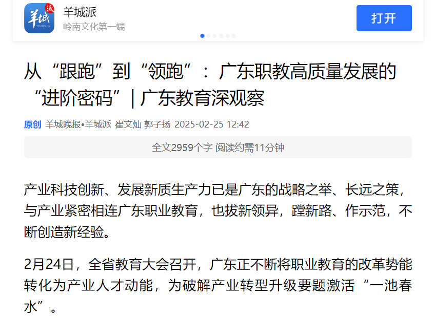 产业科技创新、发展新质生产力已是广东的战略之举、长远之策,与产业紧密相连广东职业教育,也拔新领异,蹚新路、作示范,不断创造新经验。