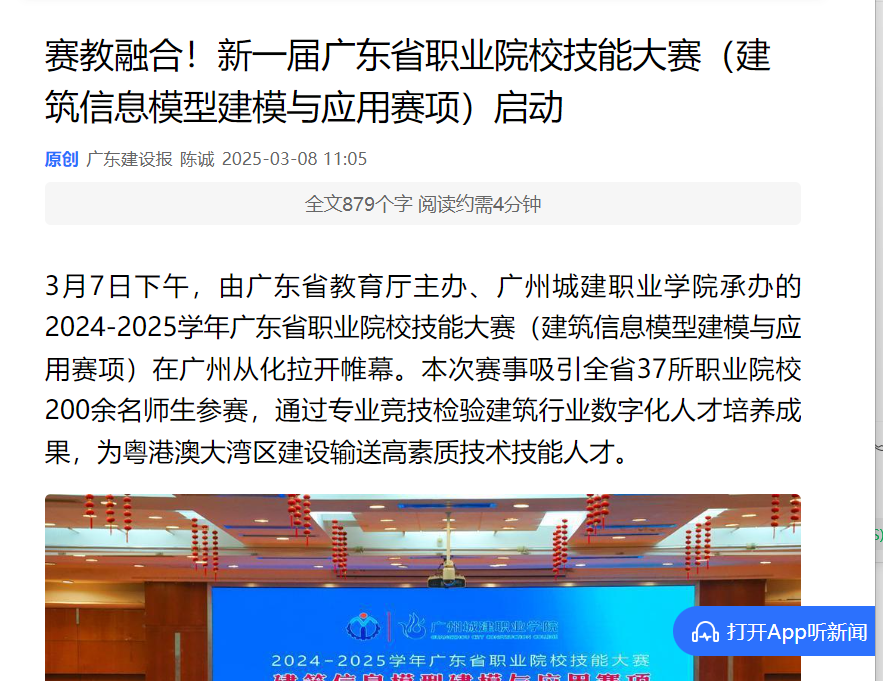 本次大赛的举办,标志着广东省职业教育在BIM技术领域的教学改革取得阶段性成果。赛事通过“以赛促教、以赛促学、以赛促创”的创新机制,为建筑行业数字化转型注入新动能。