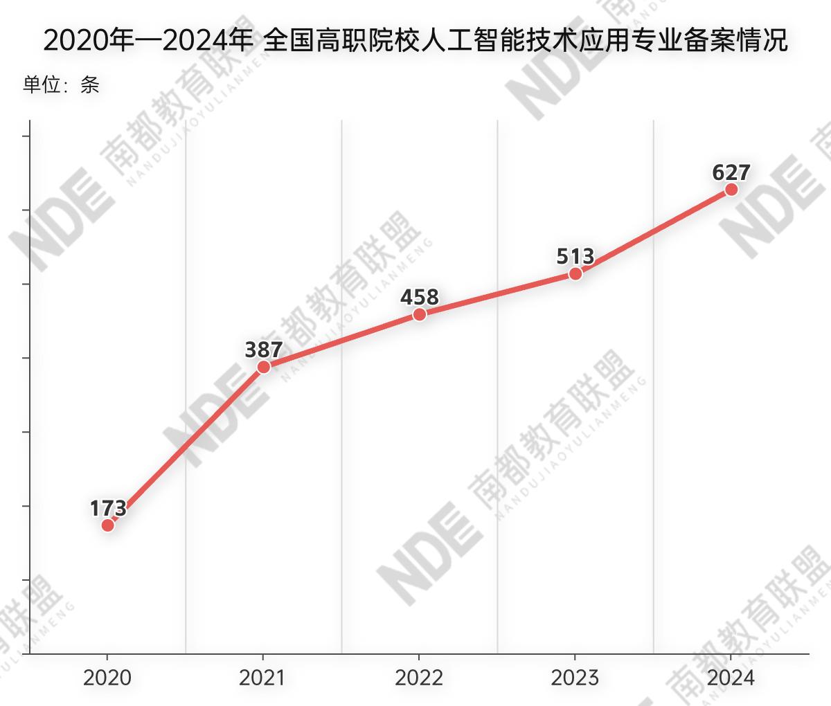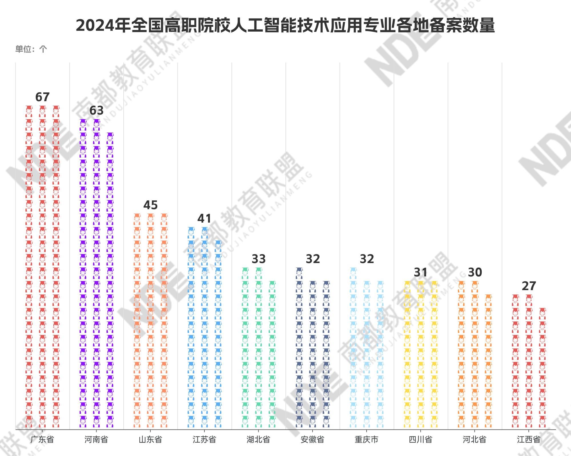 此后,这一数字不断飙升,截至2024年,共有627条高职院校人工智能技术应用专业备案记录。从地域分布来看,广东省数量最多,共有67条,包含2年制和3年制,公办院校和民办院校均有覆盖,其次为河南省63条、山东省45条、江苏省41条。