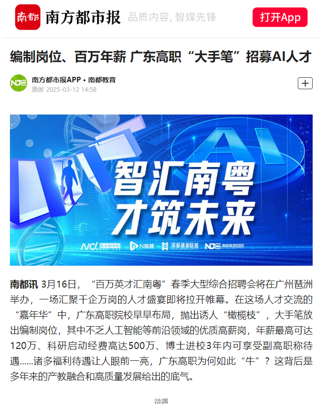 3月16日,“百万英才汇南粤”春季大型综合招聘会将在广州琶洲举办,一场汇聚千企万岗的人才盛宴即将拉开帷幕。在这场人才交流的“嘉年华”中,广东高职院校早早布局,抛出诱人“橄榄枝”,大手笔放出编制岗位,其中不乏人工智能等前沿领域的优质高薪岗,年薪最高可达120万、科研启动经费高达500万、博士进校3年内可享受副高职称待遇......诸多福利待遇让人眼前一亮,广东高职为何如此“牛”?这背后是多年来的产教融合和高质量发展给出的底气。