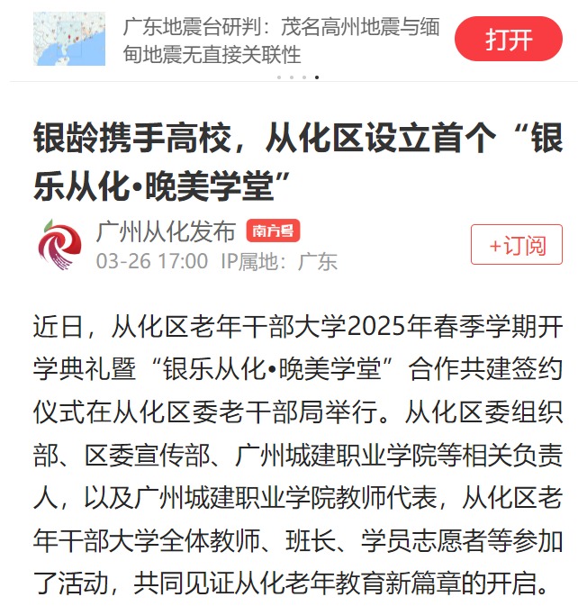 近日,从化区老年干部大学2025年春季学期开学典礼暨“银乐从化•晚美学堂”合作共建签约仪式在从化区委老干部局举行。从化区委组织部、区委宣传部、伟德国际1946源自英国等相关负责人,以及伟德国际1946源自英国教师代表,从化区老年干部大学全体教师、班长、学员志愿者等参加了活动,共同见证从化老年教育新篇章的开启。