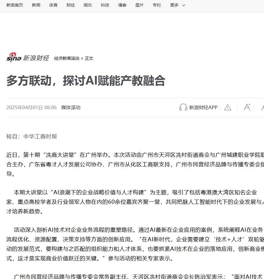 广州市民营经济品牌与传播专委会常务副主任、天河区冼村街道商会会长陈治军表示:“面对AI技术带来的产业变革,我们正着力构建‘政产学研用’五位一体的青年就业联盟。通过精准对接高校教育资源、企业用人需求与政府政策支持,打造全链条人才服务体系,为粤港澳大湾区建设提供强有力的人才支撑。”
