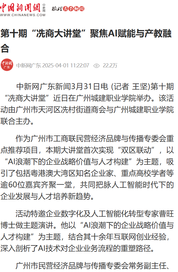 作为广州市工商联民营经济品牌与传播专委会重点推荐项目,本期大讲堂首次实现“双区联动”,以“AI浪潮下的企业战略价值与人才构建”为主题,吸引了包括粤港澳大湾区知名企业家、重点高校学者等逾60位嘉宾齐聚一堂,共同把脉人工智能时代下的企业发展与人才培养新趋势。