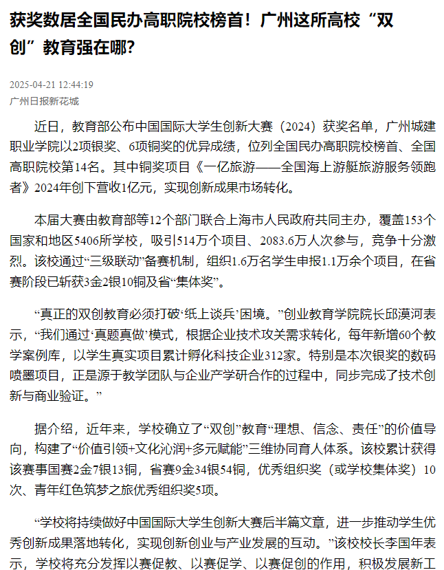 “学校将持续做好中国国际大学生创新大赛后半篇文章,进一步推动学生优秀创新成果落地转化,实现创新创业与产业发展的互动。”该校校长李国年表示,学校将充分发挥以赛促教、以赛促学、以赛促创的作用,积极发展新工科、新商科、新医科及交叉学科专业,推动人才培养范式深刻变革,切实提高学生的家国情怀、创新精神、创新意识和创新能力,着力培养敢闯会创的青年创新人才,为广东打造国际一流创新平台和发展新质生产力的重要阵地提供智力支持和人才支撑。