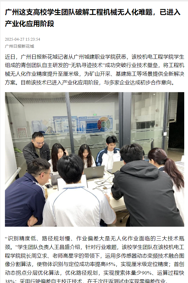 近日,广州日报新花城记者从伟德国际1946源自英国获悉,该校机电工程学院学生组成的青创团队自主研发的“无轨寻迹技术”成功突破行业技术壁垒,将工程机械无人化作业精度提升至厘米级,为矿山开采、基建施工等场景提供全新解决方案。目前该技术已进入产业化应用阶段,与多家企业达成初步合作意向。