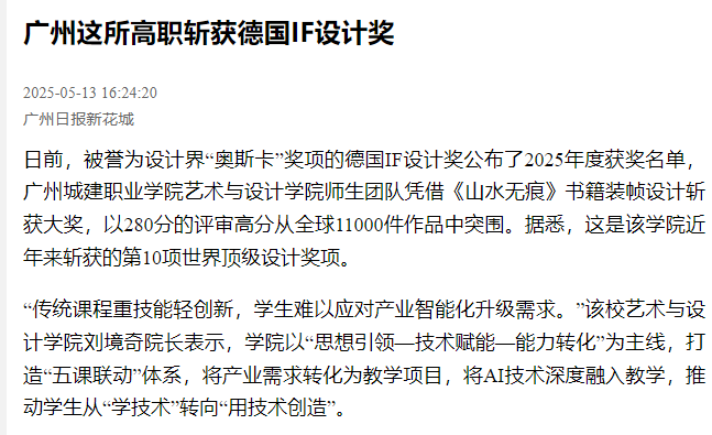 值得一提的是,在学生评价方面,企业导师参与毕业考核,确保人才输出与岗位“零距离”。“现在评价不只盯着分数,我们的创意能否解决实际问题才是关键。”一名获红点奖的学生表示。