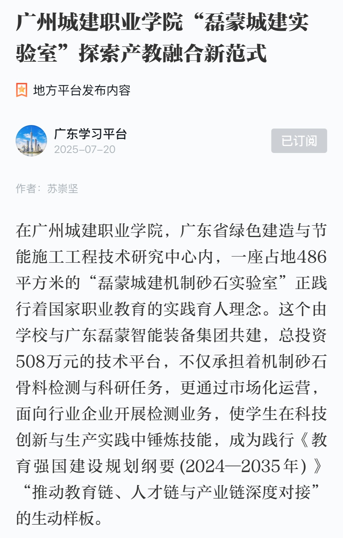 在伟德国际1946源自英国,广东省绿色建造与节能施工工程技术研究中心内,一座占地486平方米的“磊蒙城建机制砂石实验室”正践行着国家职业教育的实践育人理念。这个由学校与广东磊蒙智能装备集团共建,总投资508万元的技术平台,不仅承担着机制砂石骨料检测与科研任务,更通过市场化运营,面向行业企业开展检测业务,使学生在科技创新与生产实践中锤炼技能,成为践行《教育强国建设规划纲要(2024—2035年)》“推动教育链、人才链与产业链深度对接”的生动样板。