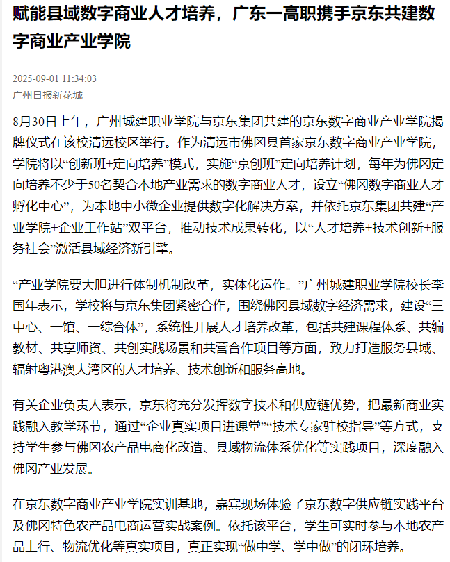 有关企业负责人表示,京东将充分发挥数字技术和供应链优势,把最新商业实践融入教学环节,通过“企业真实项目进课堂”“技术专家驻校指导”等方式,支持学生参与佛冈农产品电商化改造、县域物流体系优化等实践项目,深度融入佛冈产业发展。