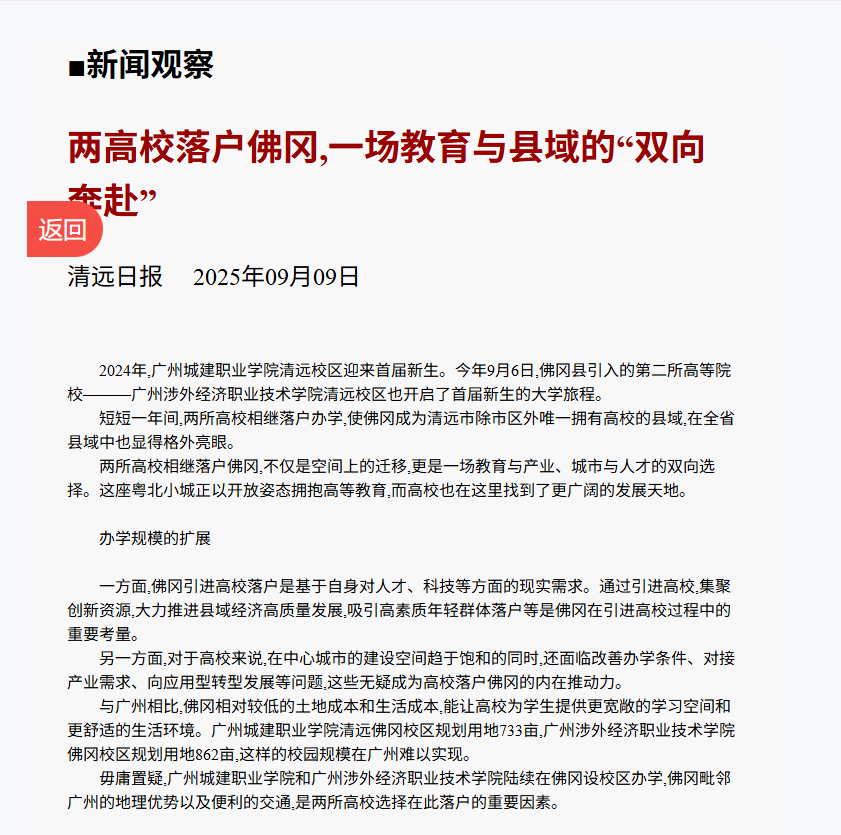 两所高校相继落户佛冈,不仅是空间上的迁移,更是一场教育与产业、城市与人才的双向选择。这座粤北小城正以开放姿态拥抱高等教育,而高校也在这里找到了更广阔的发展天地。