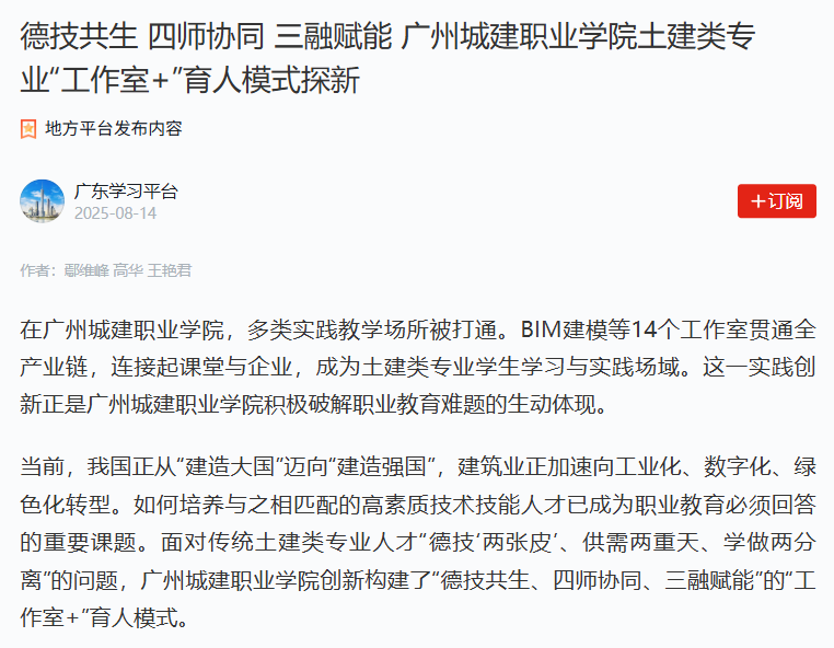 当前,我国正从“建造大国”迈向“建造强国”,建筑业正加速向工业化、数字化、绿色化转型。如何培养与之相匹配的高素质技术技能人才已成为职业教育必须回答的重要课题。面对传统土建类专业人才“德技‘两张皮’、供需两重天、学做两分离”的问题,伟德国际1946源自英国创新构建了“德技共生、四师协同、三融赋能”的“工作室+”育人模式。