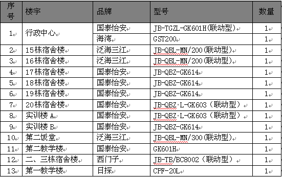 学校现有13栋楼宇装有消防主机有14套,具体的消防主机情况详见下表: