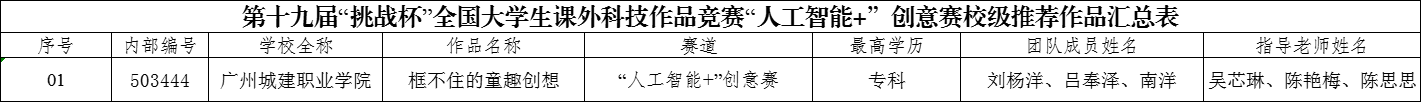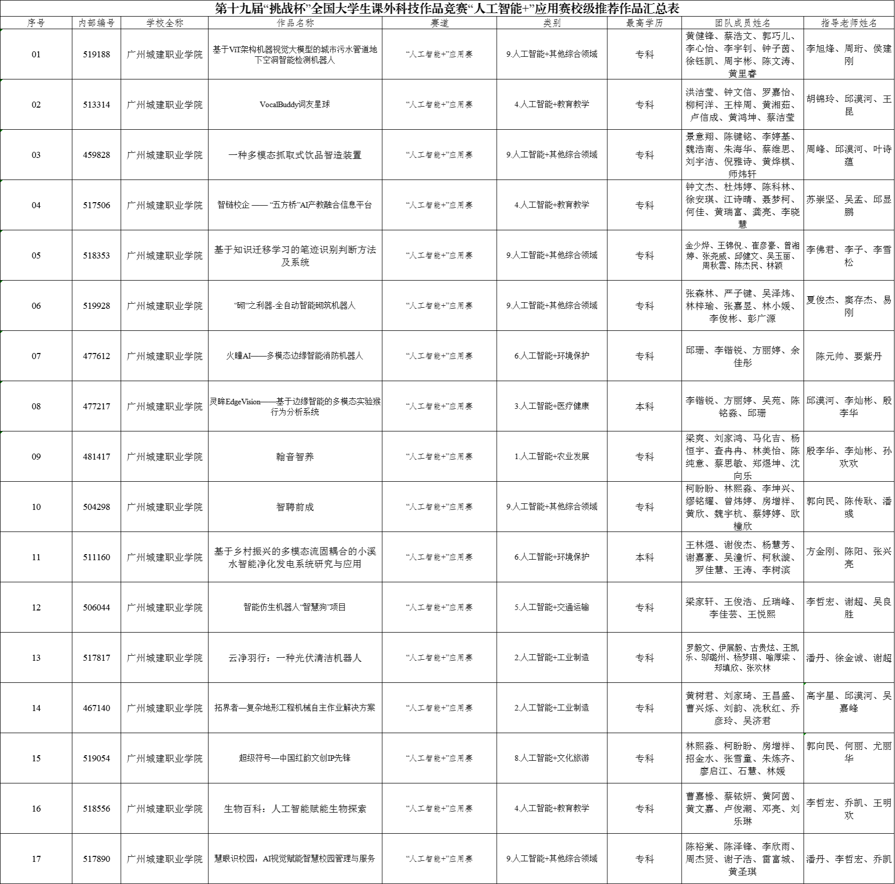 根据《关于举办第十九届“挑战杯”全国大学生课外学术科技作品竞赛“人工智能+”专项赛的通知》,按照校赛结果,创意赛拟推荐以下1个作品、应用赛拟推荐17个作品参加省复赛,现进行公示。
