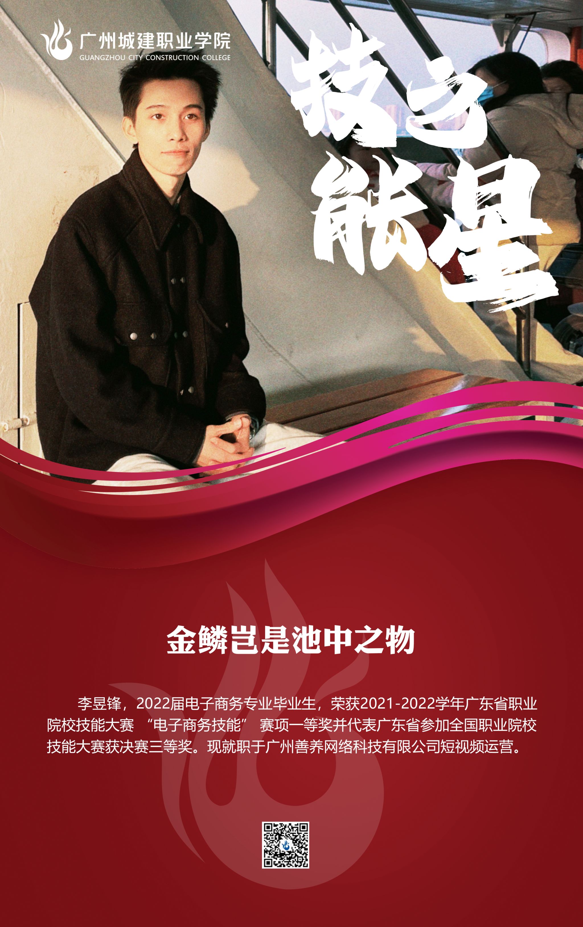 除学业成绩优秀外,他也热情投身于多种技能提升活动,不断增强自己的专业素养和实践能力。在大二时,报名参加“电子商务技能”校赛运营选拔赛。利用假期留校深入研究竞赛相关知识,他将时间管理和目标设定运用到日常学习中。通过持续数月的刻苦训练和精心准备,荣获 2021-2022 年度广东省职业院校学生专业技能大赛“电子商务技能”赛项一等奖,并代表广东省参加全国职业院校技能大赛获得三等奖。他的成绩不仅为自己赢得了荣耀,也为他的母校增添了光彩。毕业后现就职于广州善养网络科技有限公司从短视频编导工作。