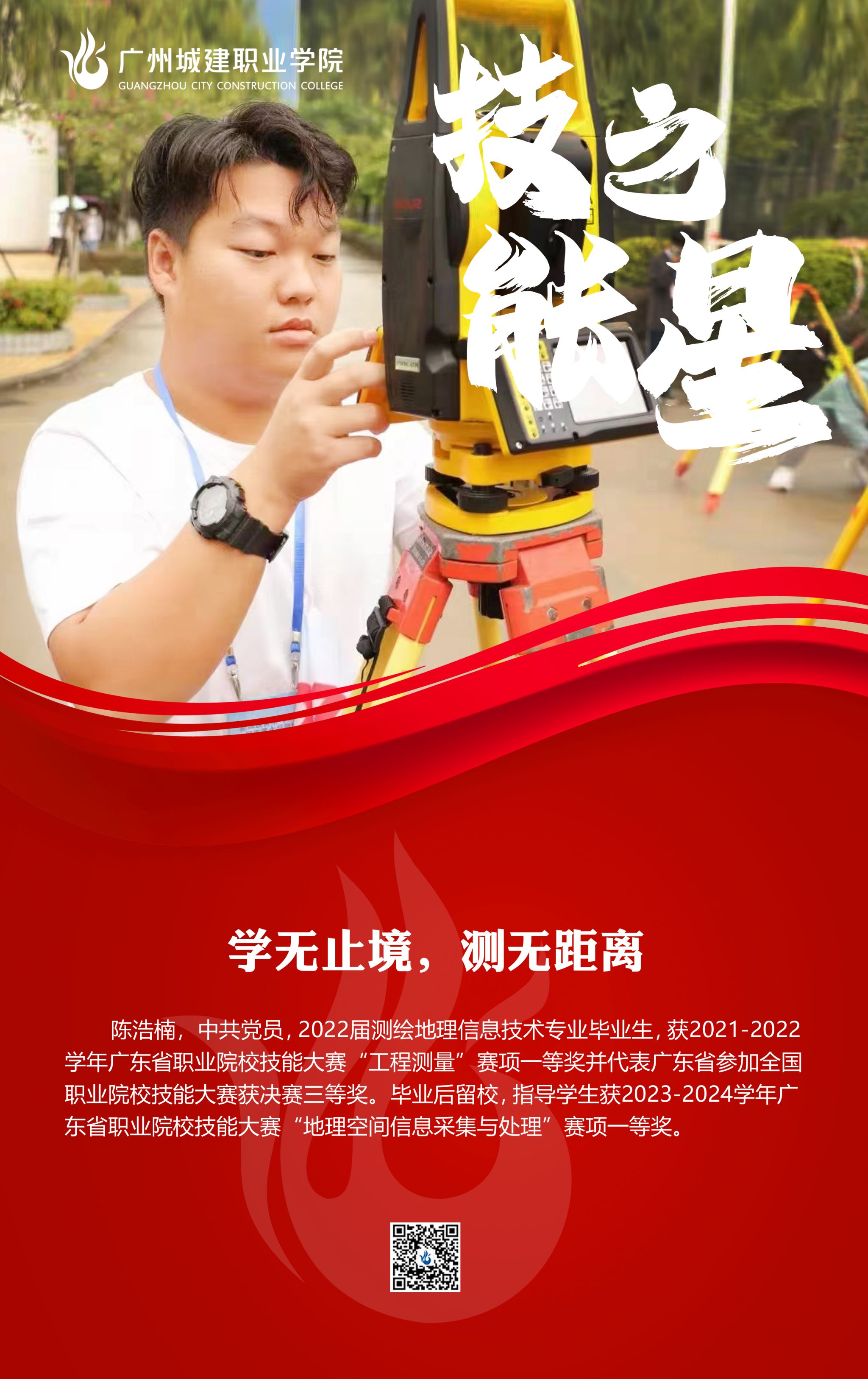 陈浩楠,男,中共党员,建筑工程学院 2022 届测绘地理信息技术专业毕业生。获 2021-2022 年度广东省职业院校学生专业技能大赛“工程测量”赛项一等奖并代表广东省参加全国职业院校技能大赛获决赛三等奖。