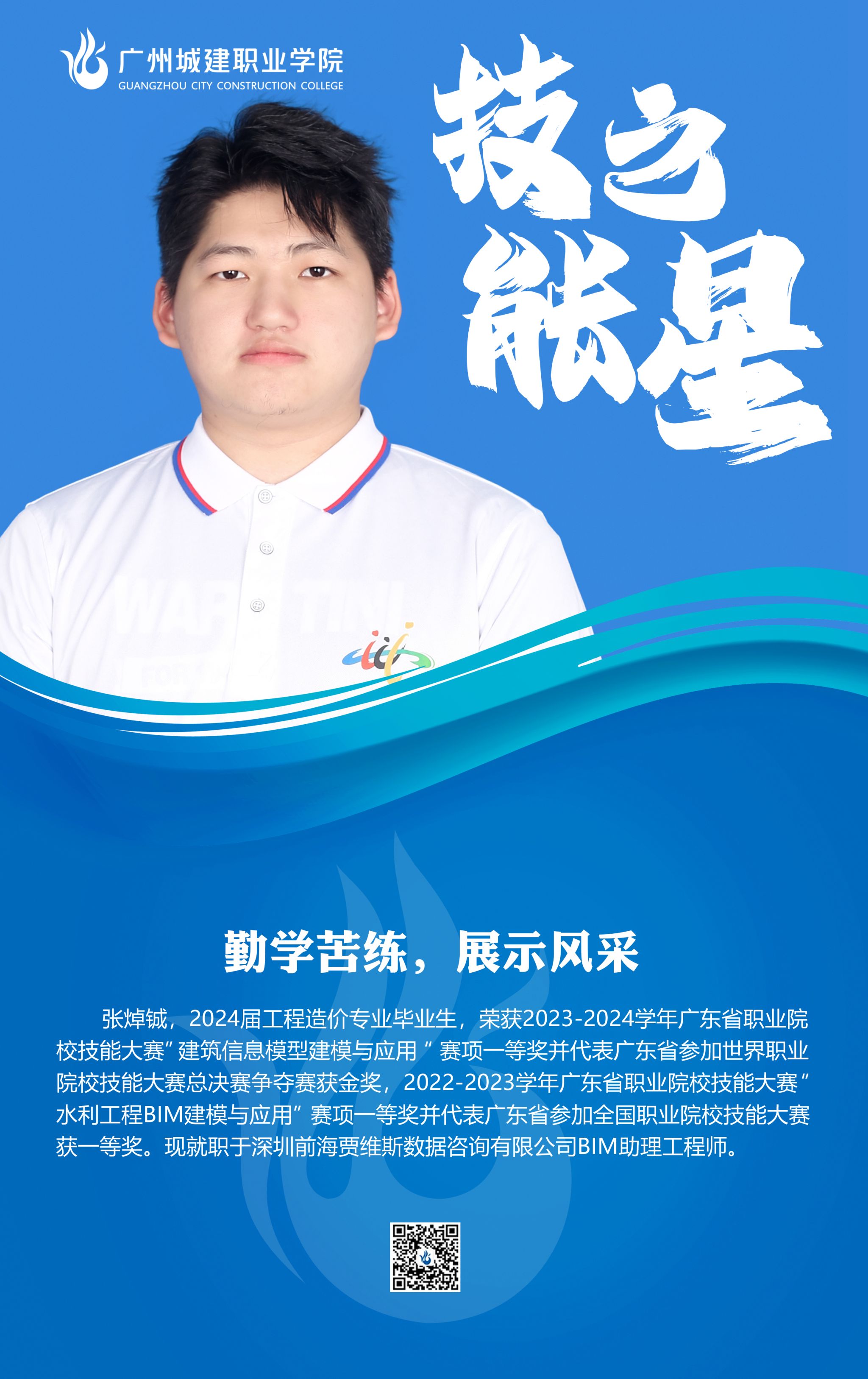 2023 年 5 月获得参加广东省职业院校学生专业技能大赛“水利工程 BIM 建模与应用”赛项一等奖,随后努力训练跟团队成员一块代表广东省参赛 2023 年全国职业院校技能大赛“水利工程 BIM 建模与应用”赛项获国赛一等奖。他先后考取 1+x 初级-建筑、一级图学会、二级图学会-机电、1+x 建筑设备中级证书。