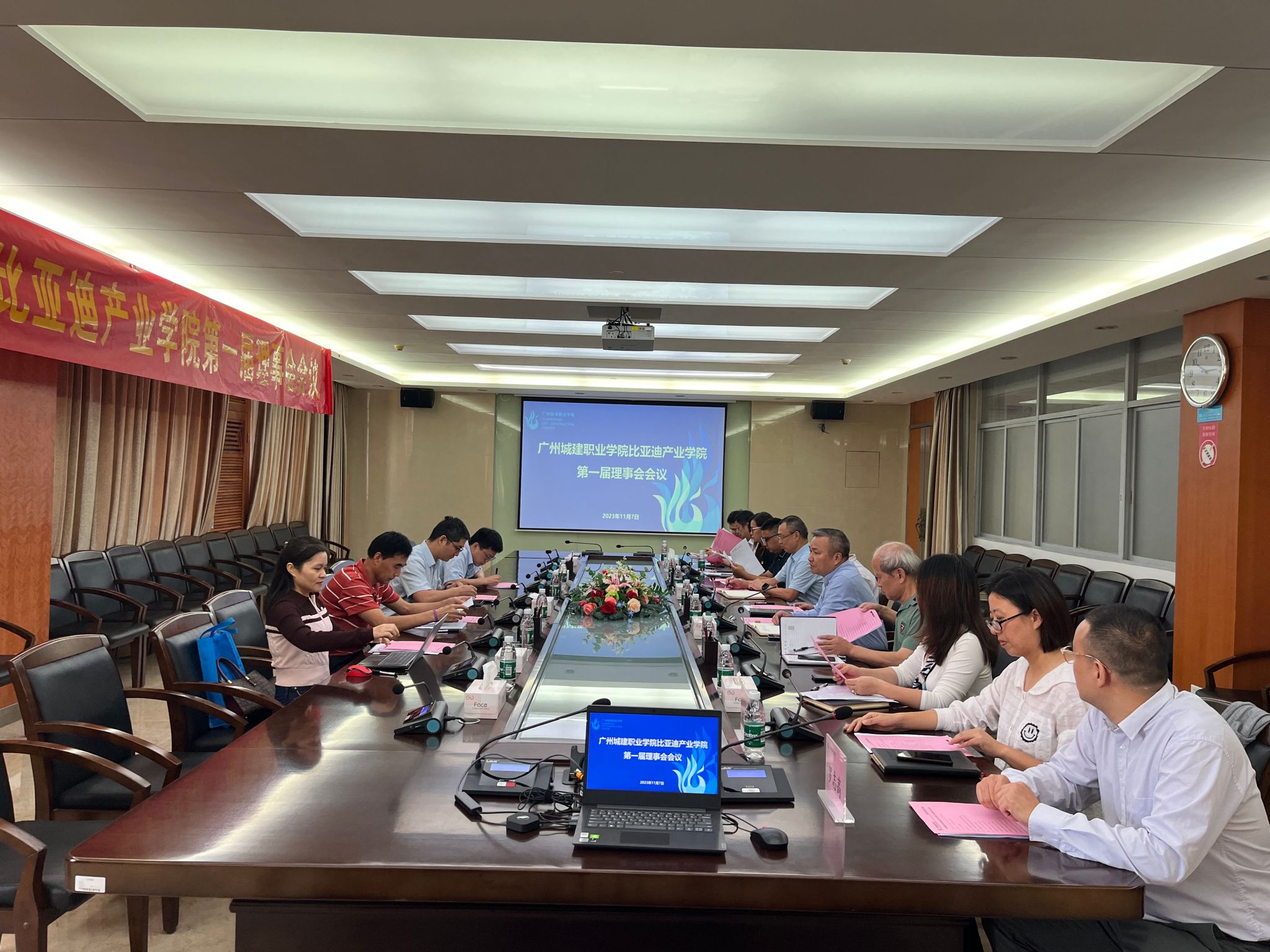 张德宜代表学校对各位理事的到来表示热烈的欢迎,向关心学校发展的各方领导表示感谢。会议审议并表决通过了“比亚迪产业学院理事会”理事名单及架构、“比亚迪产业学院章程”,推举蒋新华为理事长,比亚迪股份有限公司张高辉、风向标产教融科技有限公司荣维涛为副理事长,机电工程学院副院长牟海荣为秘书长。