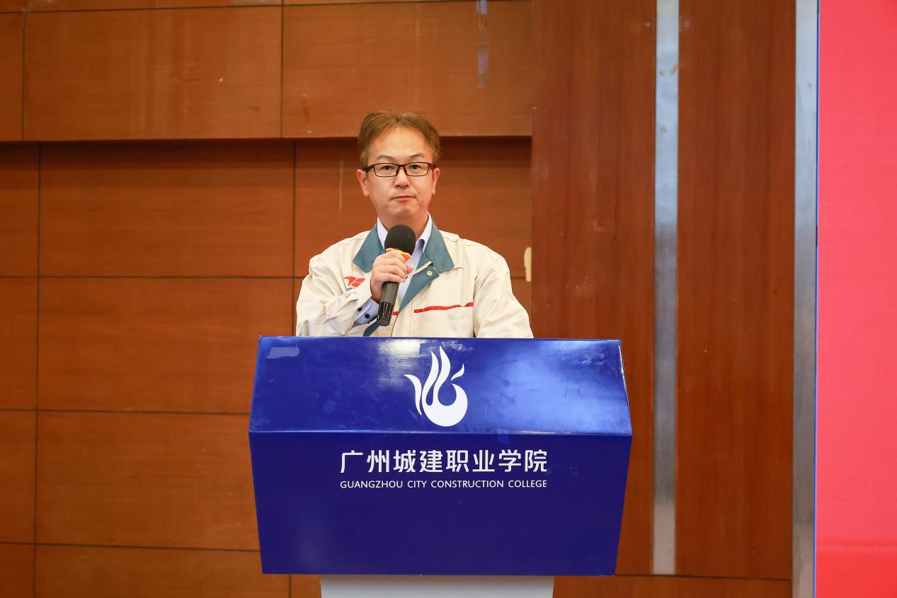 捐赠方代表三木規晶讲话。他详细介绍了丰田纺织(广州)汽车部件有限公司的经营结构和业务范围。他表示,公司通过积极履行社会责任,秉持回馈社会的理念,愿意通过奖学金项目为教育事业贡献力量。他希望获奖学生能够继续努力,发挥专业所长,为社会和企业发展做出贡献,同时欢迎更多城建学子到丰田纺织(广州)汽车部件有限公司就业。