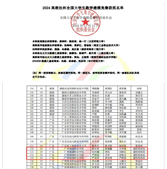 11月11日,2024年高教社杯全国大学生数学建模竞赛成绩正式揭晓,伟德官网学子斩获全国二等奖4项,广东赛区一等奖4项、二等奖7项、优胜奖2项,获奖数量创伟德官网历史新高!获奖成绩在全省高职院校中仅次于深圳信息职业技术学院、深圳职业技术大学、广东科学技术职业学院和广州铁路职业技术学院。
