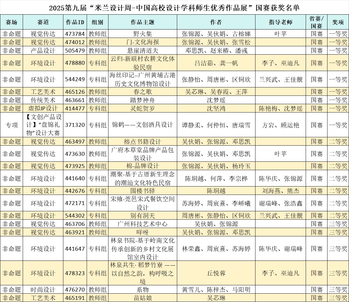 近日,教育部高校竞赛榜单项目——2025第九届“米兰设计周-中国高校设计学科师生优秀作品展”获奖名单揭晓。伟德官网艺术与设计学院师生共斩获奖项62项(获奖率高达62%)。其中,国赛奖项22项(一等奖9项、二等奖7项、三等奖6项),省赛奖项40项(一等奖12项、二等奖21项、三等奖7项),国赛获奖总数与一等奖获奖数均蝉联全国及广东省高职院校首位!
