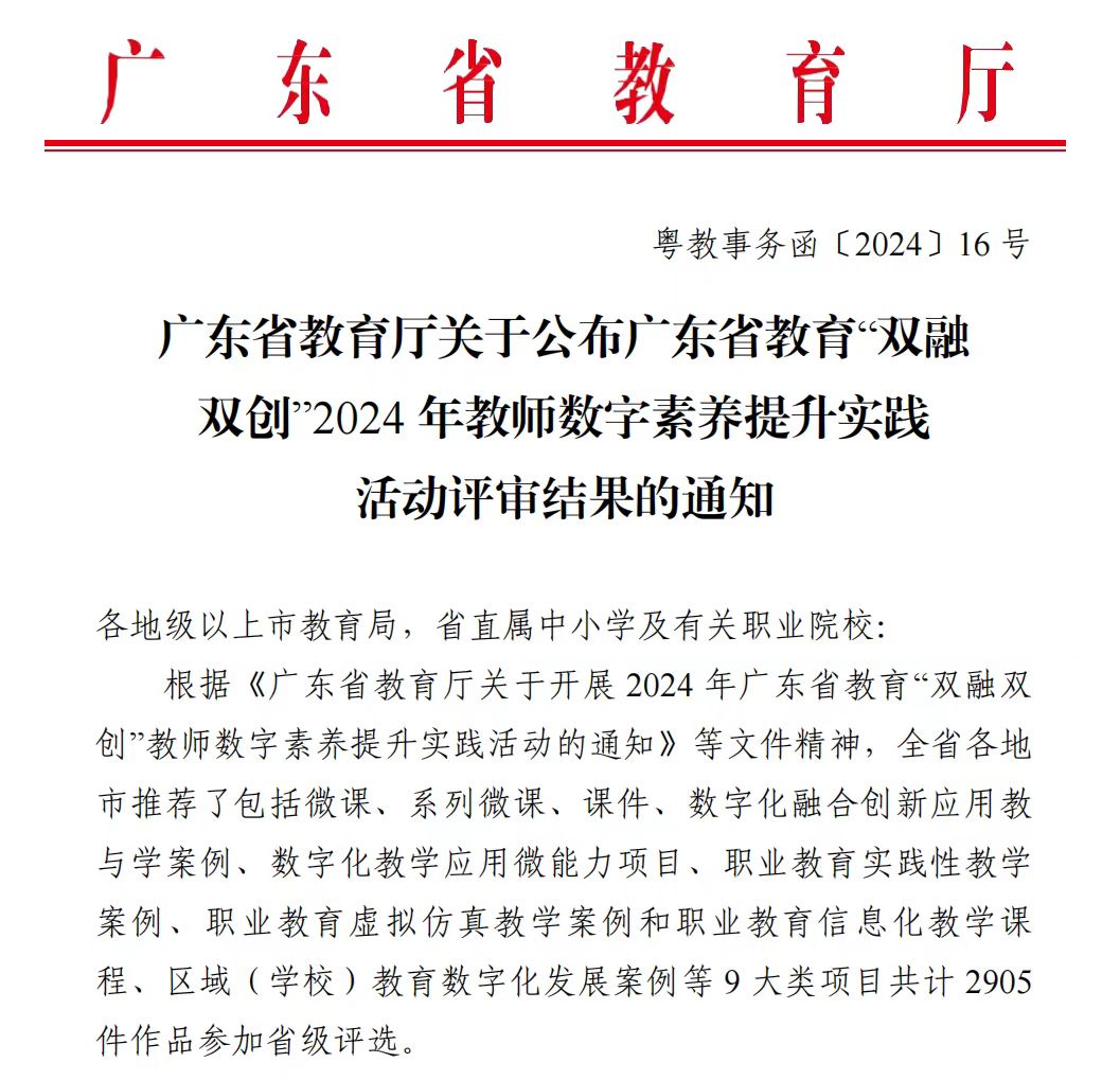 近日,广东省教育厅发布了关于公布广东省教育“双融双创”2024年教师数字素养提升实践活动评审结果的通知,在实践性教学案例和虚拟仿真教学案例大类中伟德官网共获一等奖1项(人文学院)、三等奖3项(机电工程学院2项、艺术与设计学院1项),成绩居高职院校前列(全省高职院校在此两大类中共获一等奖5件、二等奖14件、三等奖19件),这是伟德官网在提升教师数字素养方面的又一突破。