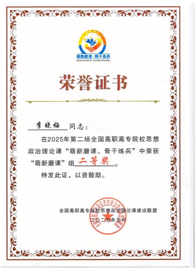 近日,全国高职高专院校思想政治理论课建设联盟发布了《关于公布2025年第二场全国高职高专院校思想政治理论课“萌新磨课、骨干练兵”教学展示活动获奖名单的通知》,伟德官网马克思主义学院李晓梅老师获得“萌新磨课”组二等奖的好成绩。