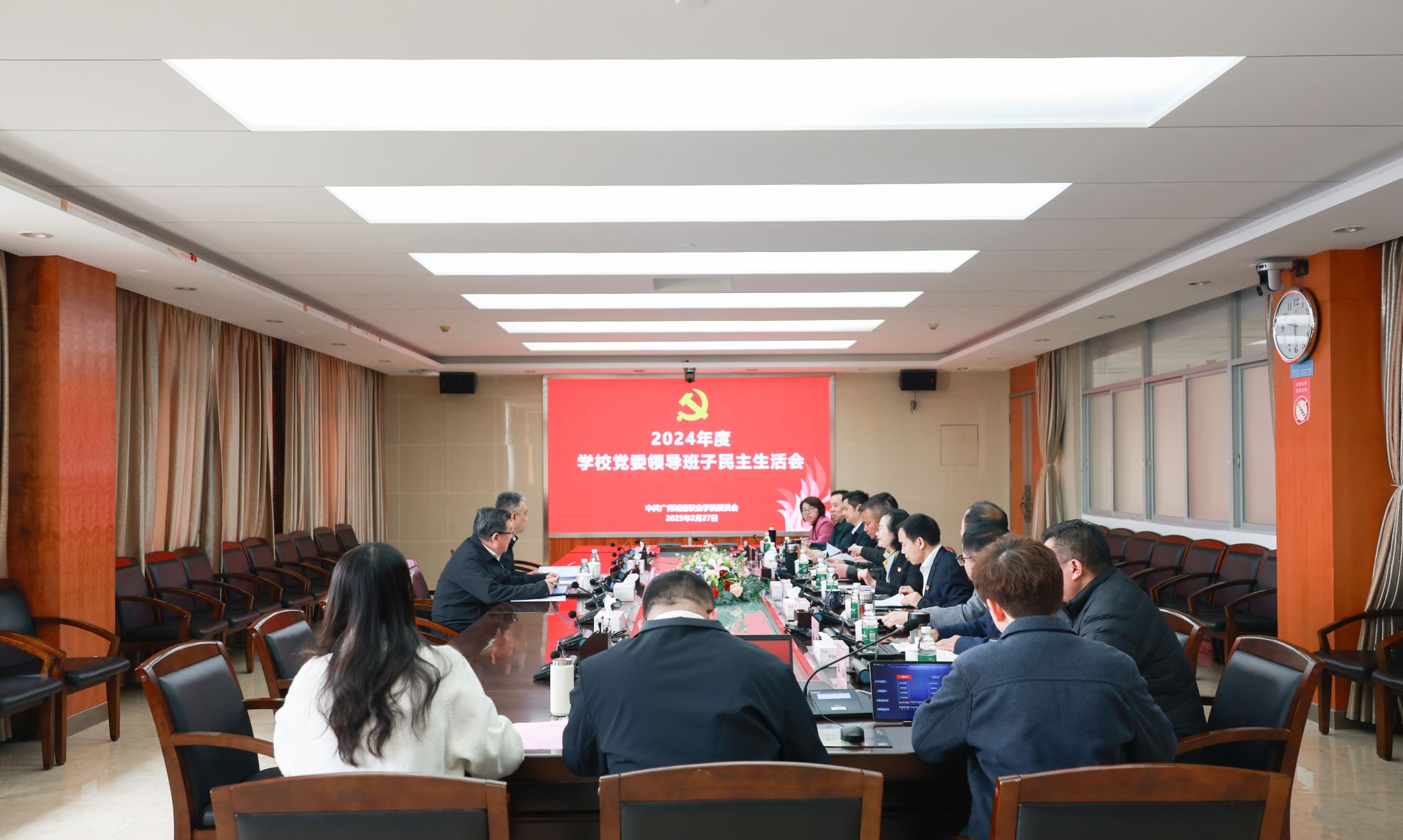 2月27日上午,2024年度党员校领导民主生活会在行政楼501会议室召开。广东省委教育工委安保处处长江存余、二级调研员王晓亮到会指导。学校党委书记黄学茭主持会议并讲话,全体党委领导班子参加会议。