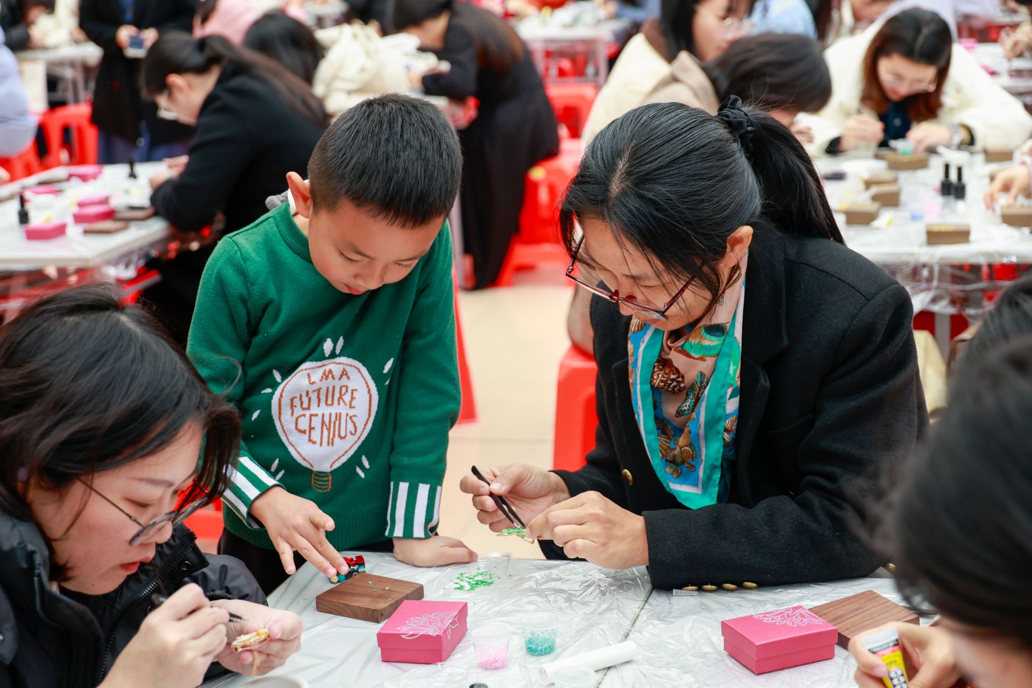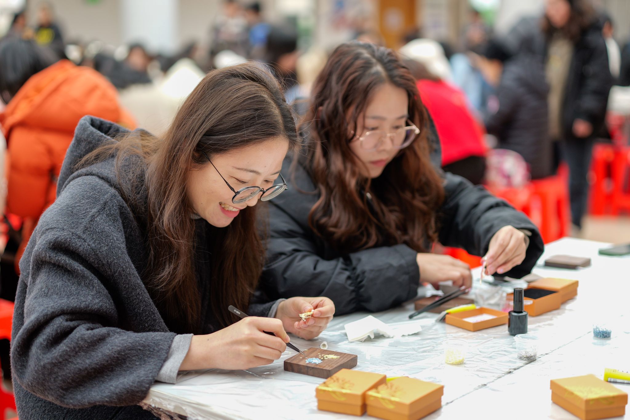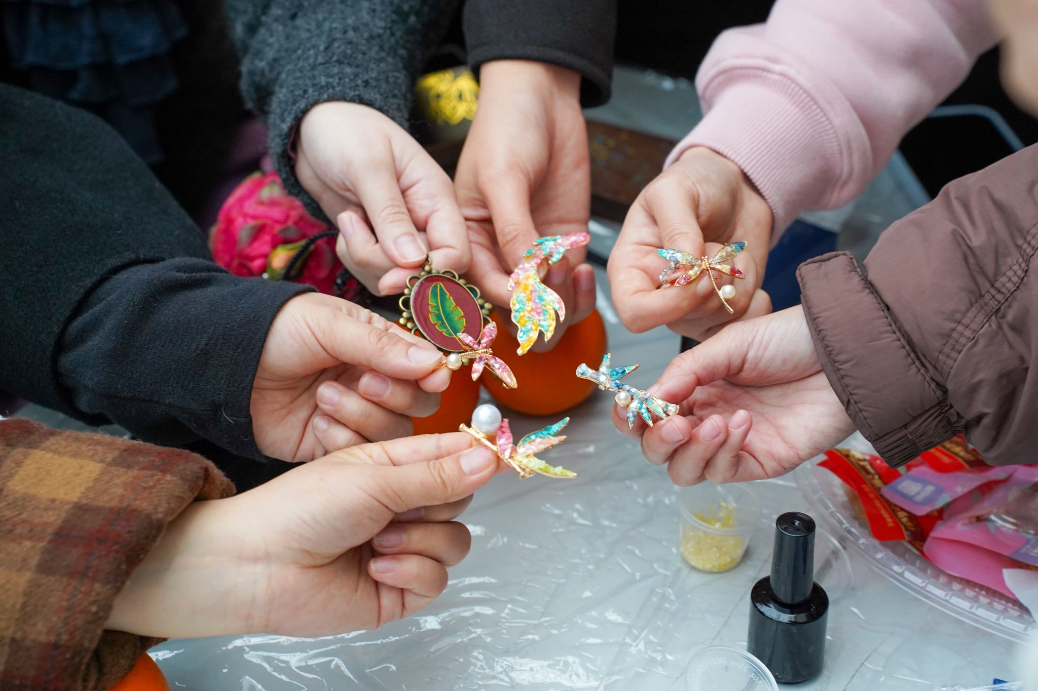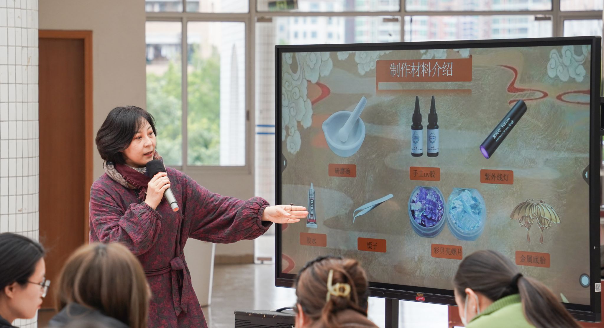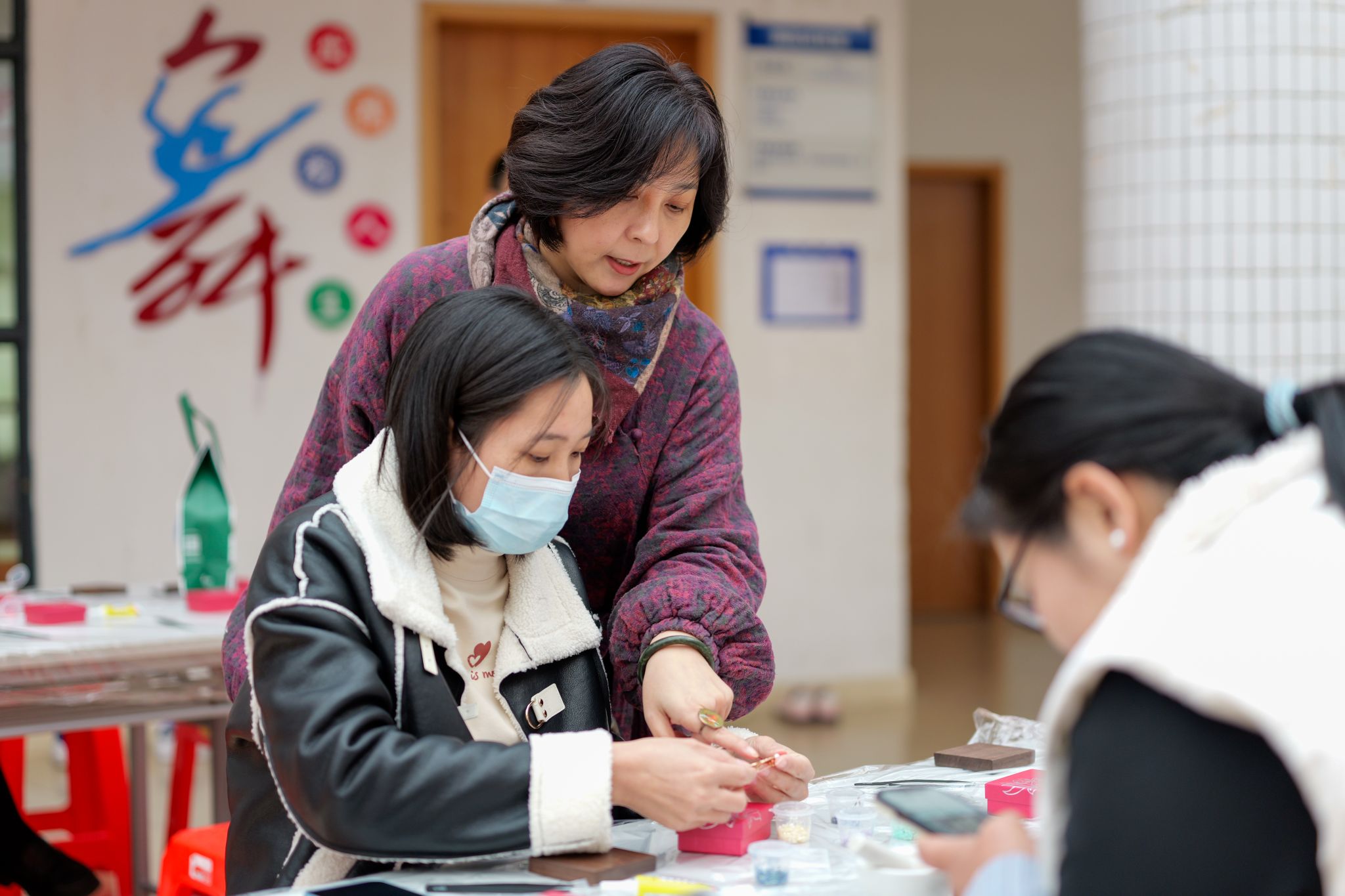 活动现场,在专业老师的指导下,大家全身心的投入创作,作品涵盖花卉、山水、现代等多元风格,现场气氛热烈。经过一个多小时的专注创作,女教职工们将传统螺钿工艺与现代审美结合,创作出兼具古典韵味与时尚创意且独一无二的胸针作品。