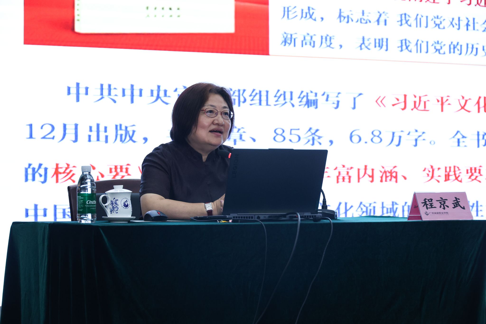 程京武教授以《文运同国运相牵 文脉同国脉相连——学习贯彻习近平文化思想》为题,详细解读了习近平文化思想的提出背景、源流探溯、丰富内涵,并结合高校文化建设工作,提出了坚持“政治性”、聚焦“思想性”、突出“教育性”等3点希望与建议。