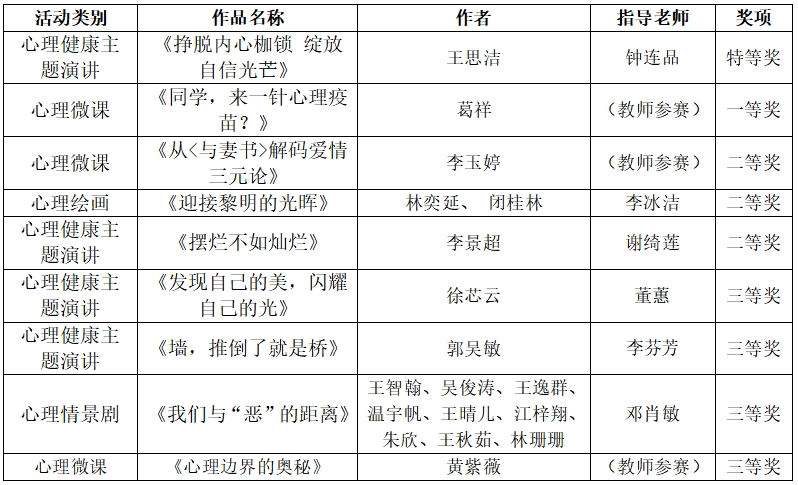 伟德官网师生在广东省大学生心理健康月系列活动中的优异表现,不仅为学校赢得了荣誉,也为推动全省大学生心理健康教育工作的发展做出了积极贡献。伟德官网将继续开展形式多样的心理健康主题教育活动,不断增强心理健康教育吸引力和感染力,提高大学生心理素质,促进学生心理健康素质与思想道德素质、科学文化素质协调发展。