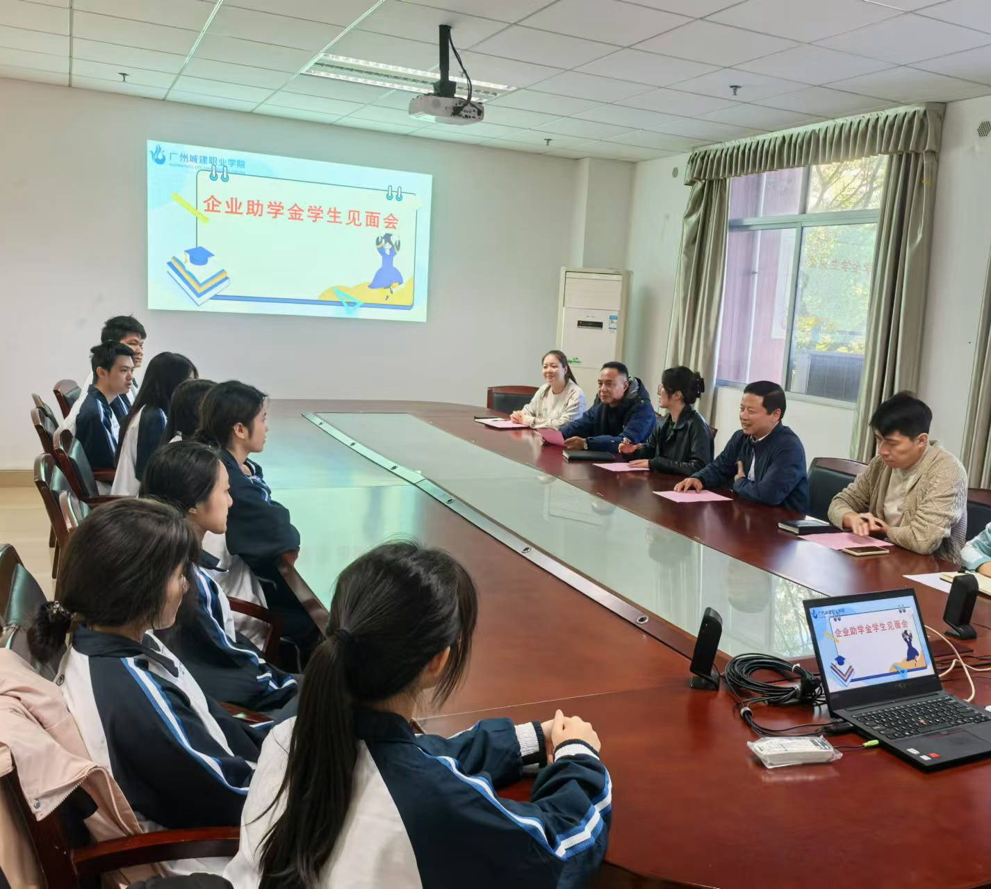 11月29日,伟德官网在广州校区行政楼205会议室举行企业助学金学生见面会。伟德官网校长助理吴锐、后勤处副处长李琼、学生处副处长谭宇欣,广州鹏杰教育投资有限公司总经理尹晖、总经理助理尹燨以及获得企业助学金的学生们出席会议。会议由学生处资助中心主任林妙贞主持。