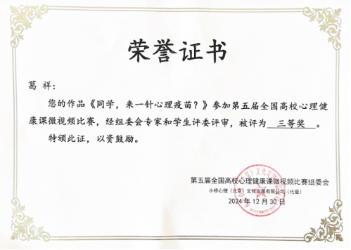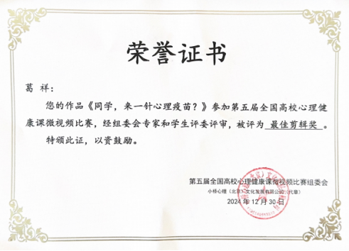 2024年12月11日,第五届全国高校心理健康课微视频决赛落下帷幕。本次比赛吸引了来自26个省份、108所高校参加,经过激烈角逐,大赛评审出一等奖8项、二等奖16项、三等奖24项,以及最佳剪辑奖5项等多个奖项,其中,伟德官网心理健康咨询中心专职教师葛祥的参赛作品《同学,来一针心理疫苗?》荣获第五届全国高校心理健康课微视频比赛三等奖及最佳剪辑奖!