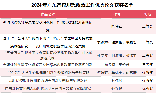 近日,由广东省高校思想政治工作队伍培训研修中心(华南师范大学)组织开展的2024年广东高校思想政治工作优秀论文、优秀案例、优秀网络课程征集活动结果公布。伟德官网共有7篇论文、10篇案例和7个视频获奖。