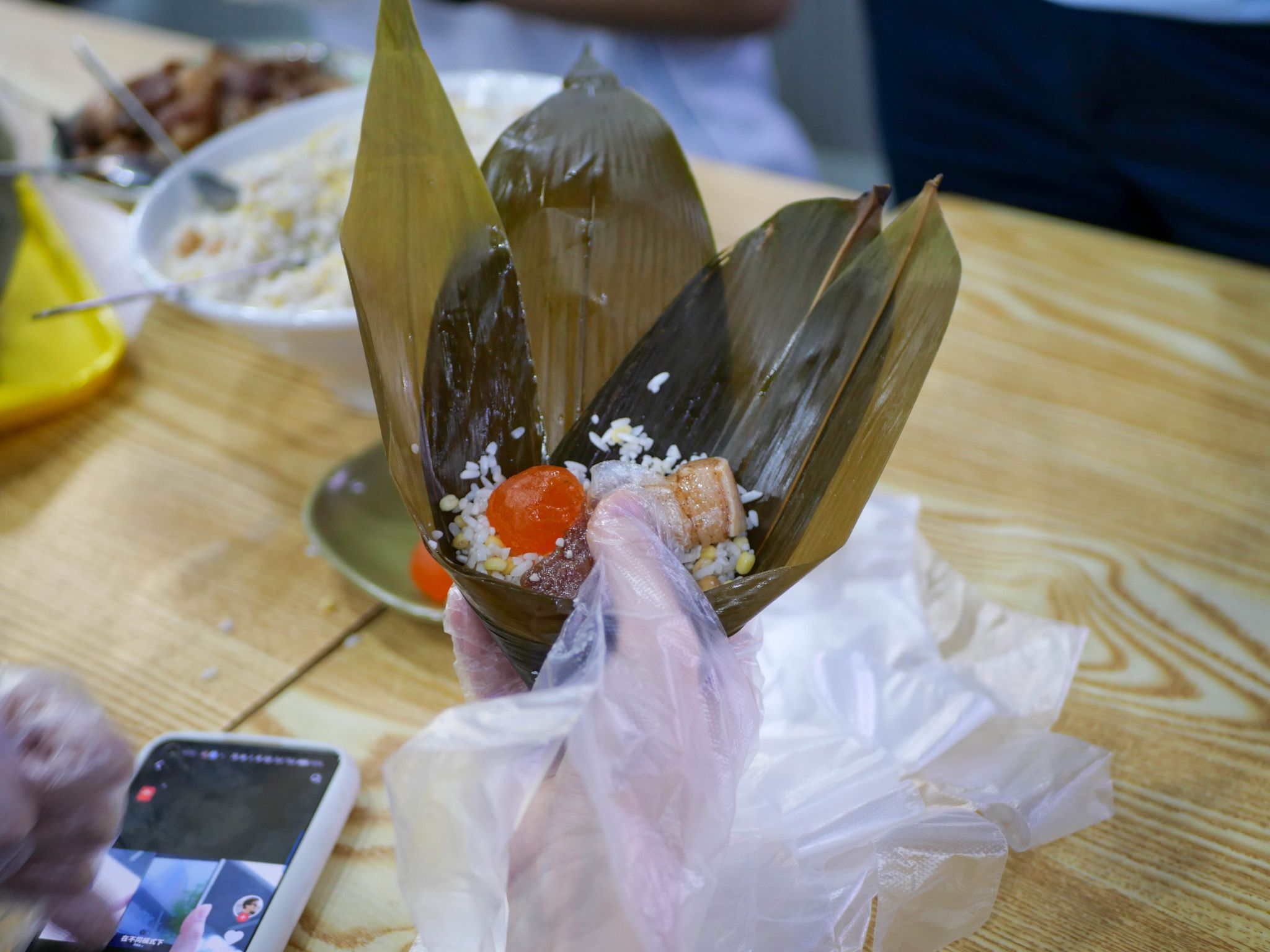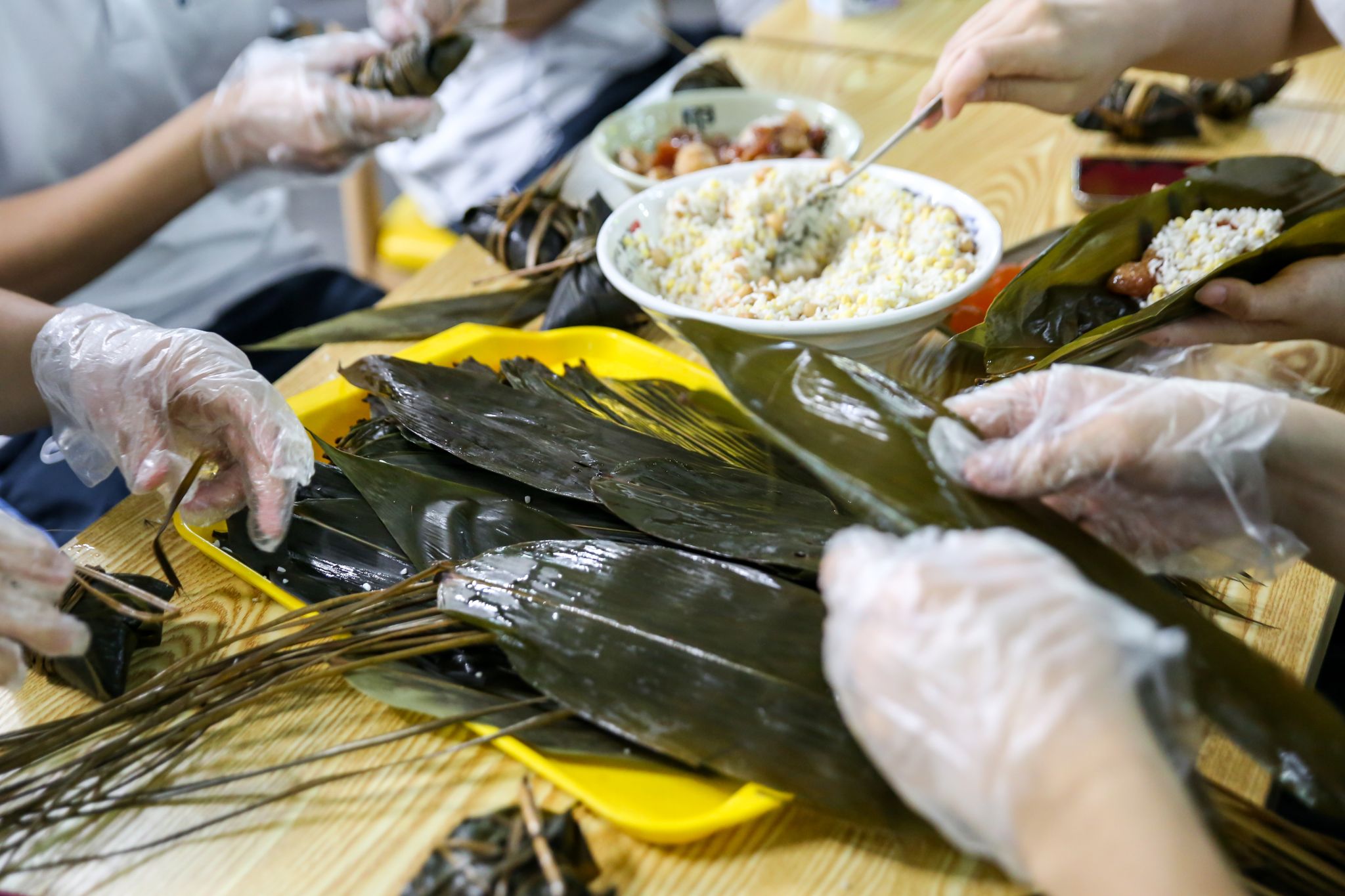 活动中,经验丰富的食堂阿姨化身“老师”,耐心地向师生们讲解包粽子的步骤和技巧。“先把粽叶卷成漏斗状,然后放糯米,再根据个人口味加入馅料,最后用棉线扎紧。”阿姨一边讲解,一边进行示范,一片片翠绿的粽叶在手中翻转折叠,不一会儿就变成了一个个饱满紧实的粽子。