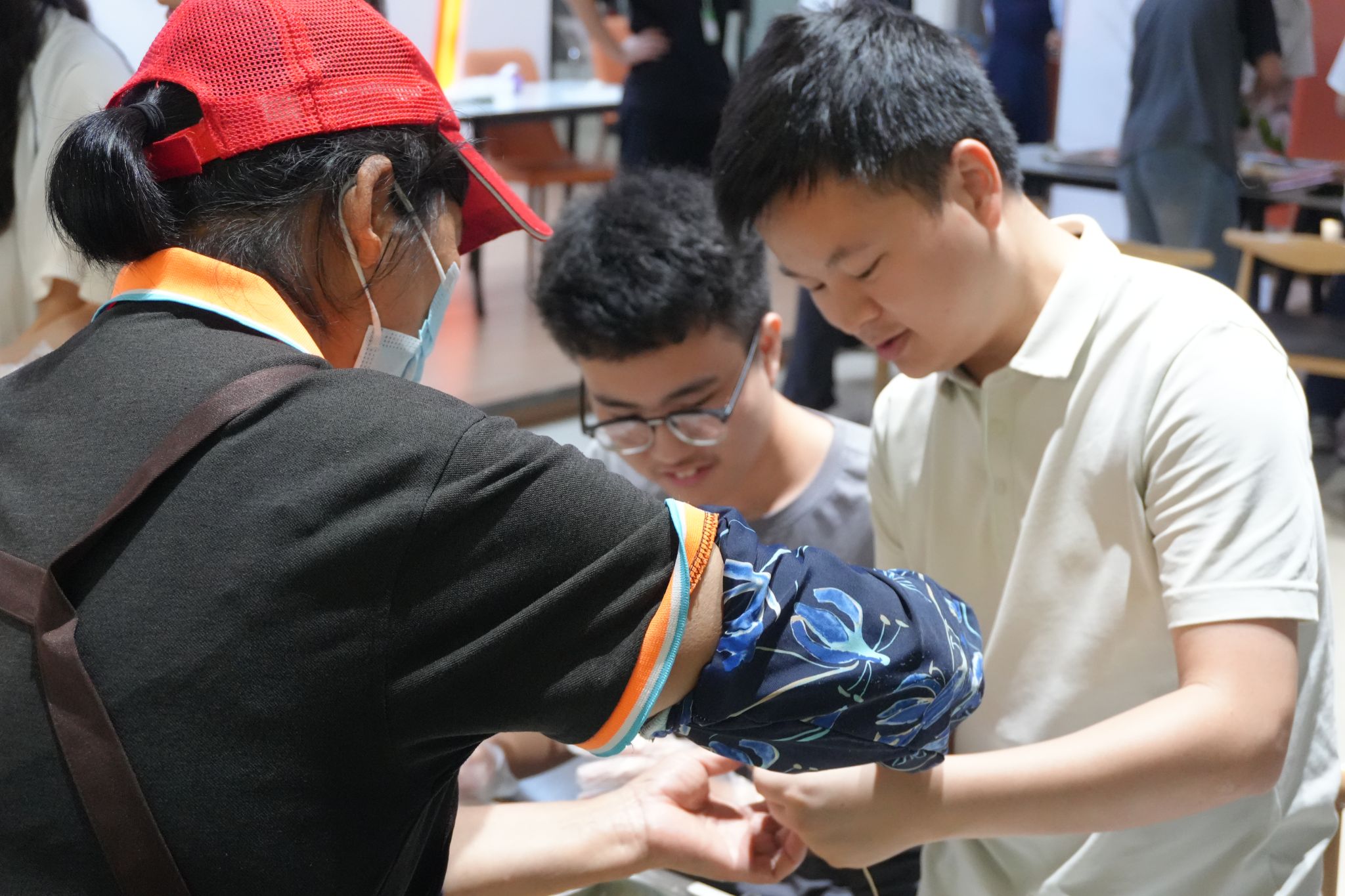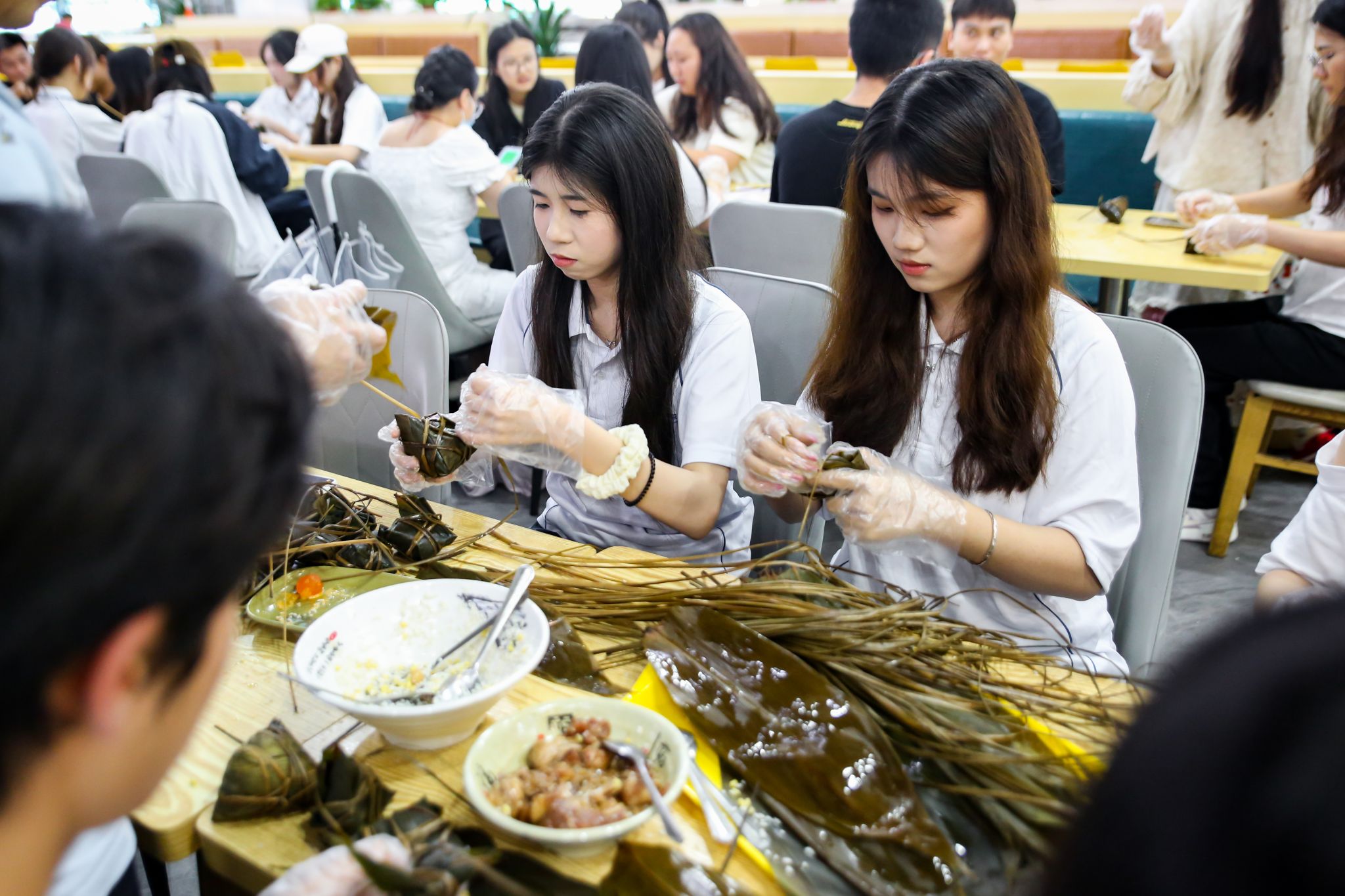 师生们围坐在一起,纷纷拿起粽叶跃跃欲试。起初,不少人包出的粽子形状各异,有的粽叶散开,有的糯米漏出,引得大家笑声连连。但在阿姨的指导帮助下,大家逐渐掌握了技巧,动作越来越娴熟。老师和同学们相互交流、相互学习,现场气氛热烈而融洽。在欢声笑语中,师生们手中的粽叶上下翻飞,一个个形态各异的粽子很快摆满了桌子,师生们共同体验包粽子的乐趣,感受传统节日的独特魅力。