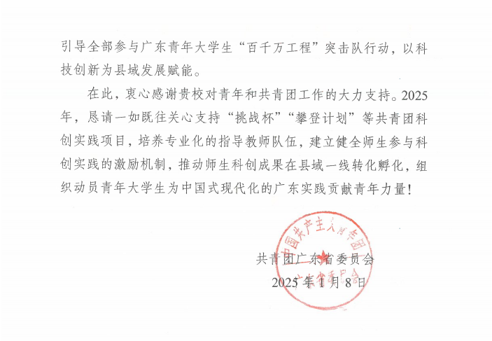 近日,伟德官网收到了来自共青团广东省委员会的感谢信,对伟德官网在青年和共青团工作领域所展现出的卓越组织能力和取得的优异成绩表示高度赞赏和衷心感谢,并勉励伟德官网要一如既往关心支持“挑战杯”“攀登计划”等共青团科创实践项目,培养专业化的指导教师队伍,建立健全师生参与科创实践的激励机制,推动师生科创成果在县域一线转化孵化,组织更多青年大学生为中国式现代化的广东实践贡献青年力量。