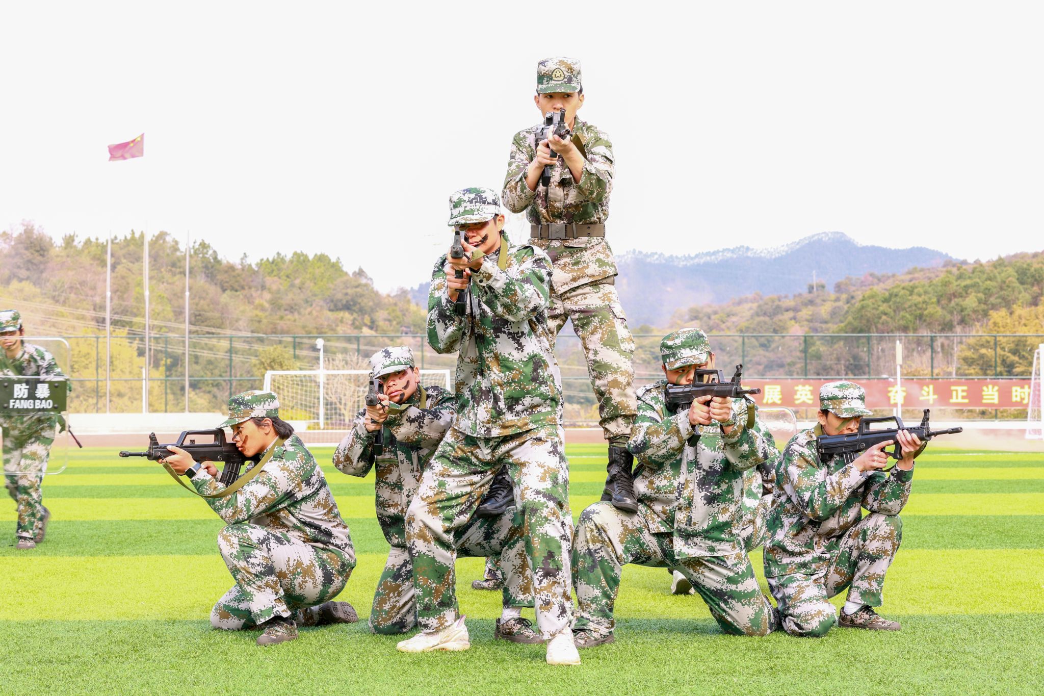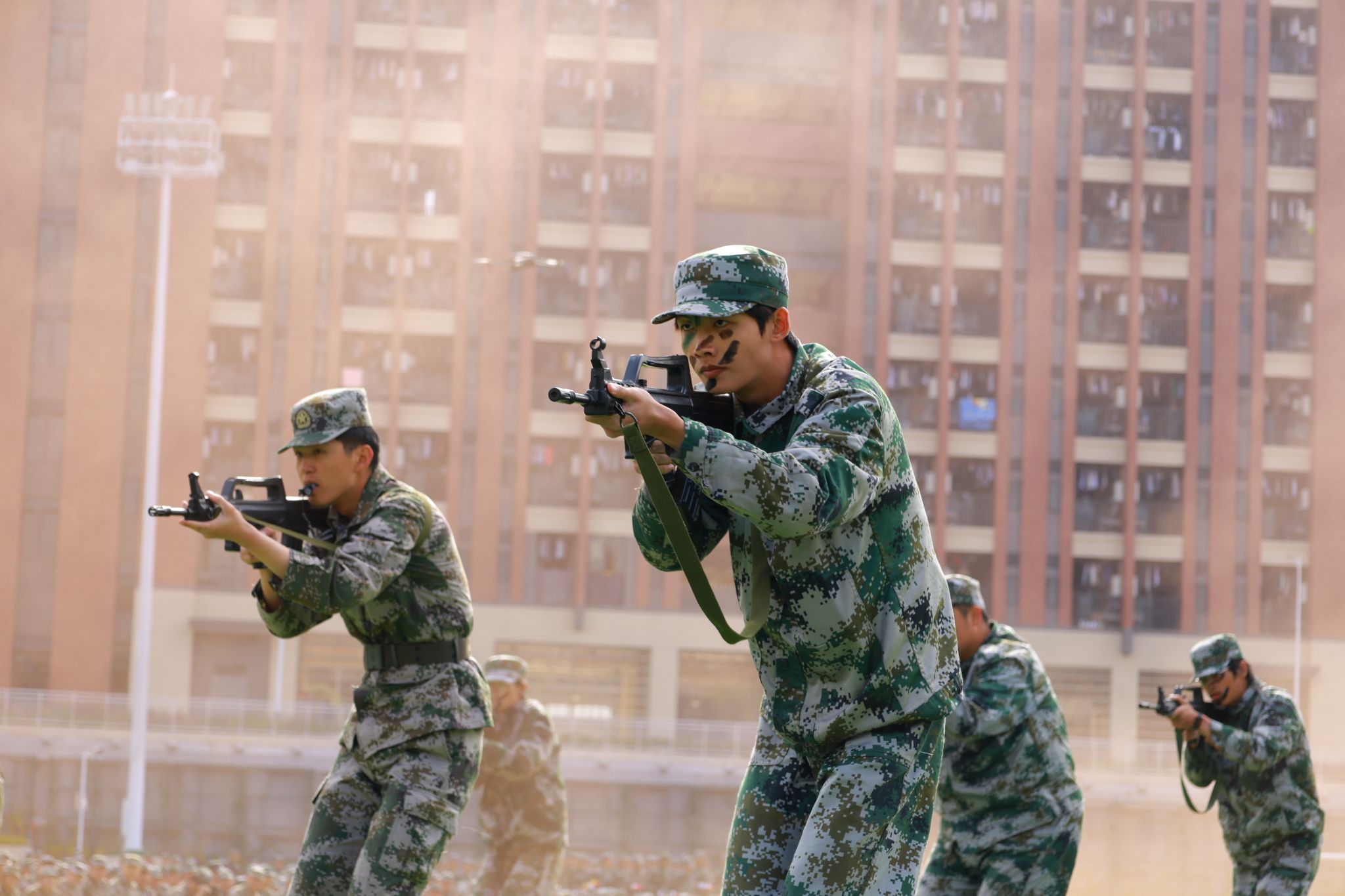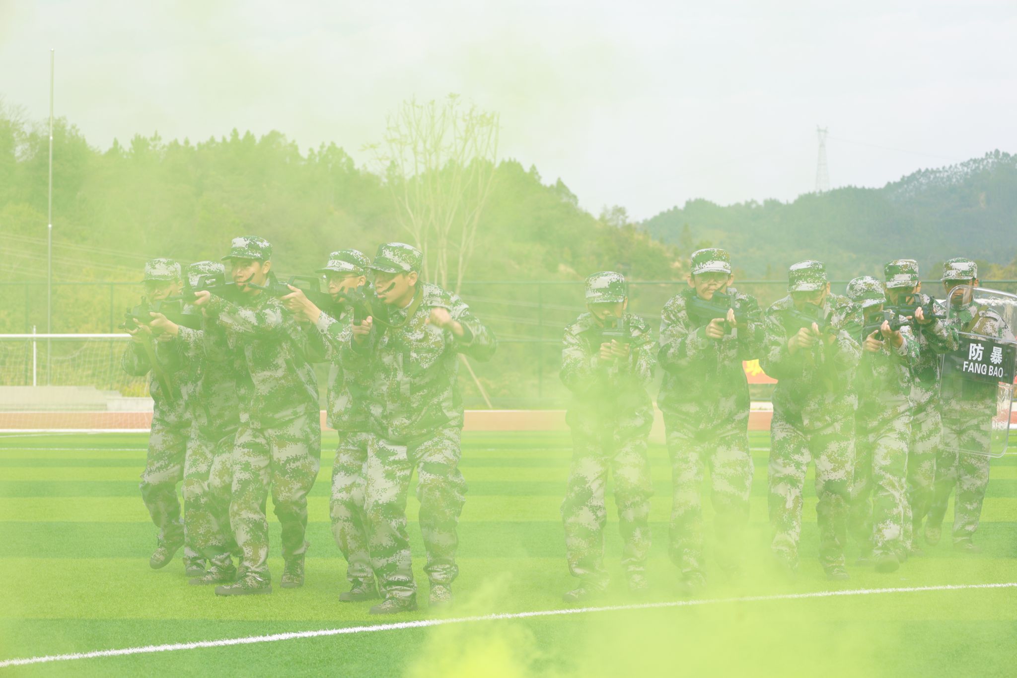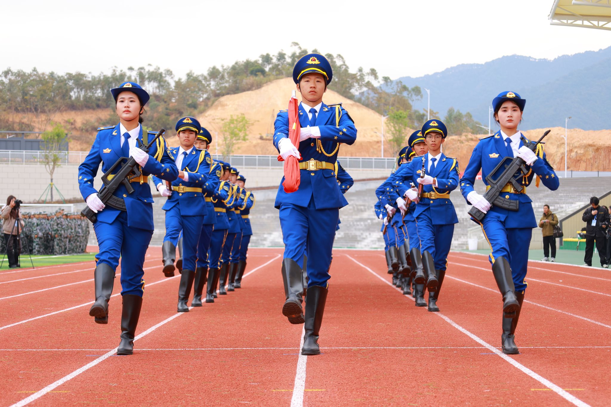 紧接着,《分列式进行曲》响起,各营方阵以整齐划一的步伐、铿锵有力的口号,依次通过主席台接受检阅;匕首操、短棍术、军体拳、手语旗语操、反恐战术等表演方阵依次登场。