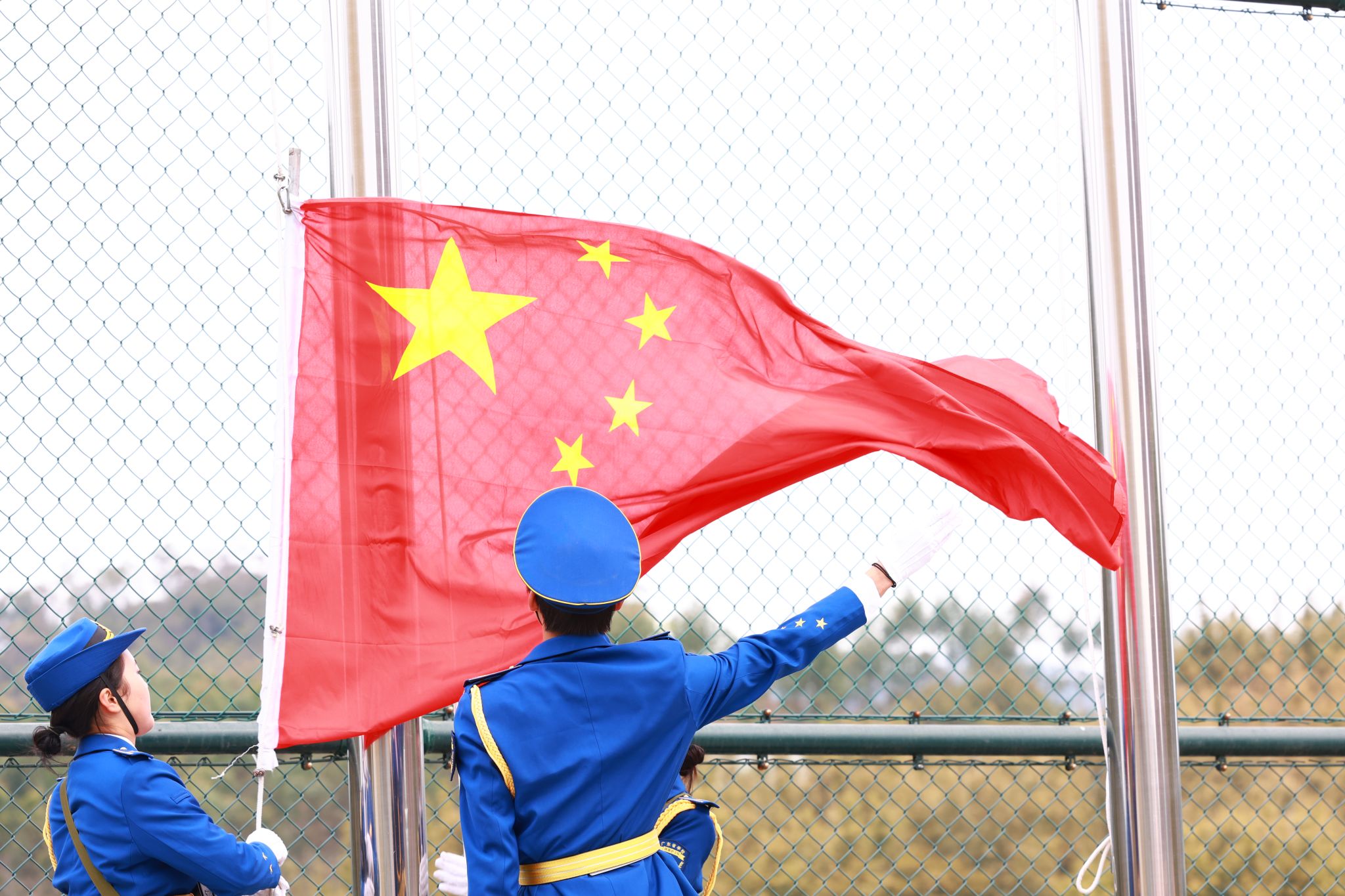 大会伊始,国旗护卫队成员身着统一制服,步履坚定有力,护送着鲜艳的五星红旗走向升旗台。伴随着雄壮的国歌声,五星红旗冉冉升起。