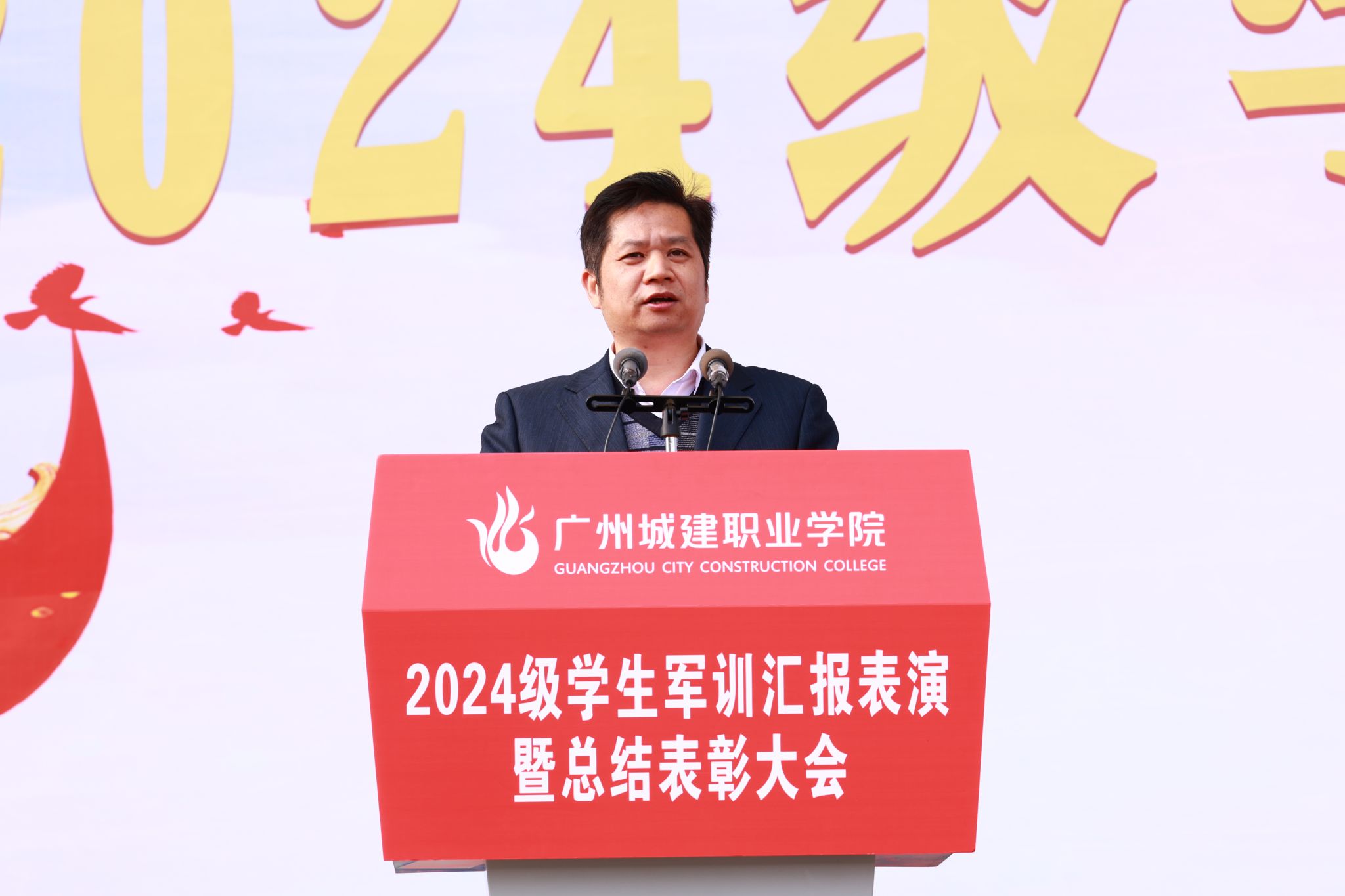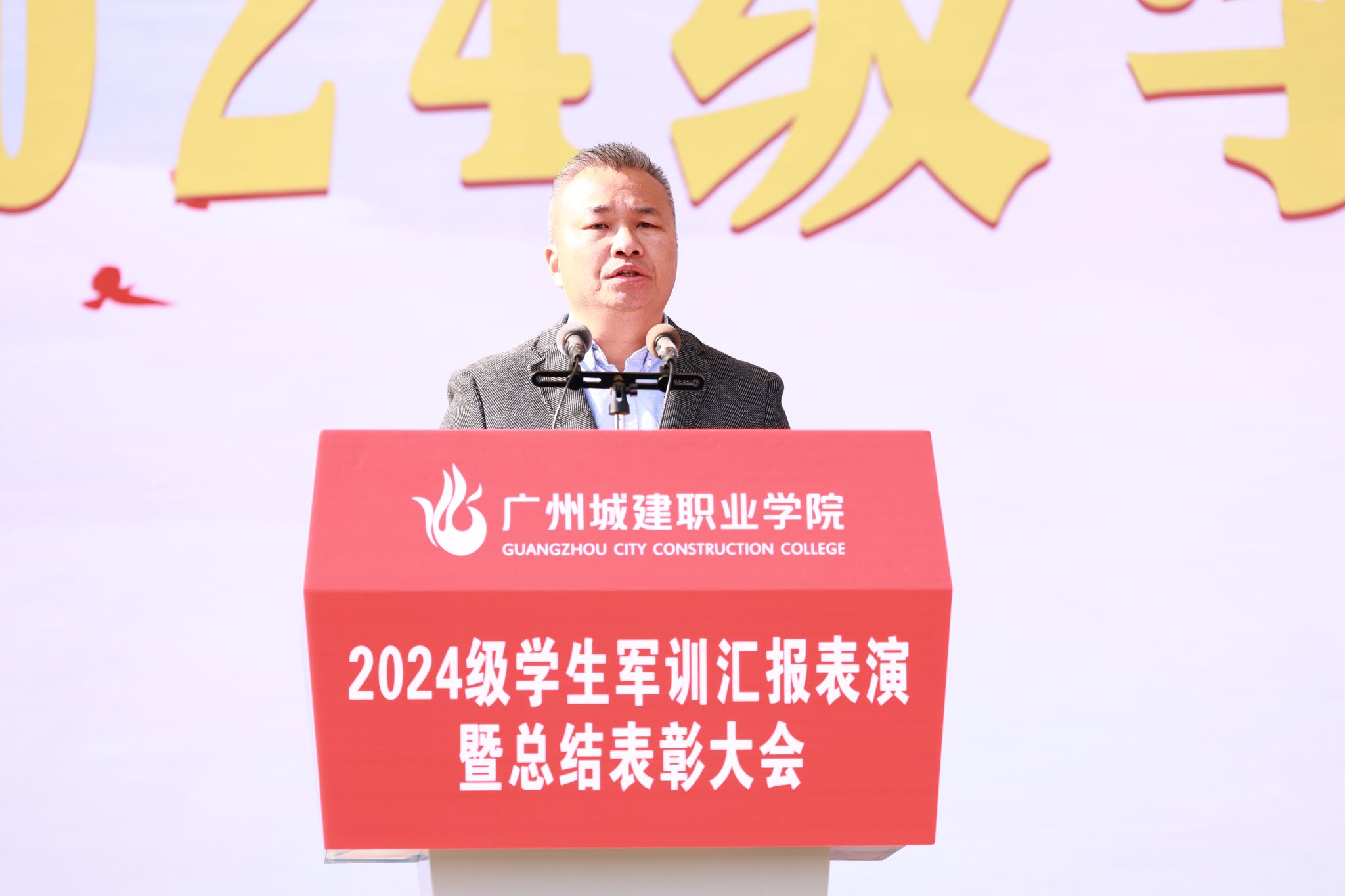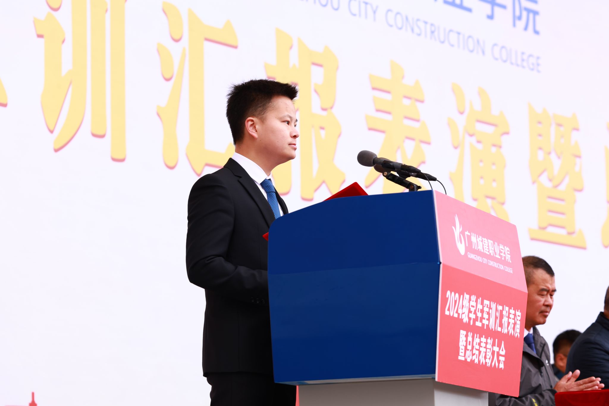 校长助理、党委武装部部长孔练光作军训总结。他对同学们的优异表现表示热烈祝贺,充分肯定军训成果,并向教官、辅导员及全体参与者表示感谢。他表示,清远校区首次冬训在多方共同努力下圆满完成,同学们的理想信念更加坚定,精神境界得到提升,不仅锻炼了同学们的意志品质,锻炼了吃苦耐劳的顽强作风,还增强了组织纪律性和集体荣誉感。他希望同学们以军训为契机,秉持校训精神,继续在学习和生活中追求卓越,成为新时代的优秀青年。