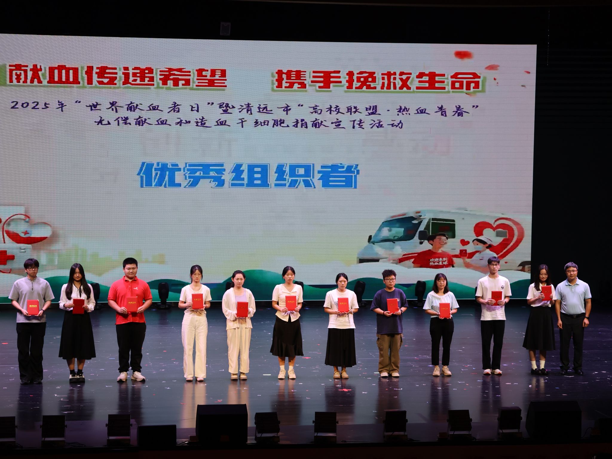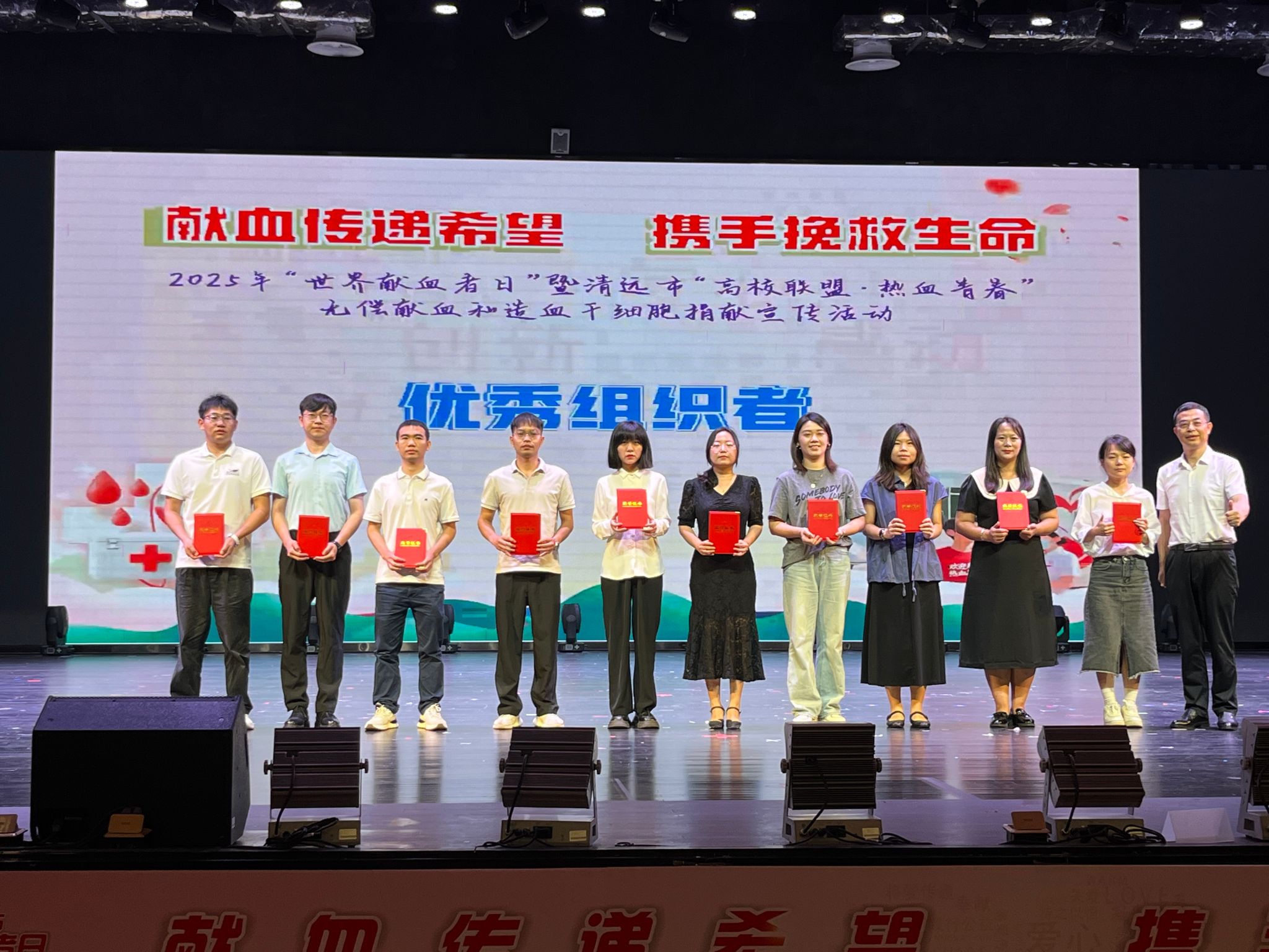 6月5日,在第22个“世界献血者日”来临之际,2025年庆祝“世界献血者日”暨清远市第二届“高校联盟·热血青春”无偿献血和造血干细胞捐献宣传活动在广东金融学院(清远校区)举行,清远市红十字会、广东省职教城(清远)事务中心、市中心血站以及清城区、清新区、佛冈县、阳山县红十字会等单位领导嘉宾出席活动,伟德官网学生处副处长曾德钦、团委副书记王文泽应邀出席。伟德官网荣获“清远市无偿献血高校联盟优秀组织奖”,王文泽老师、陈子彦同学荣获2024年度清远市普通高等学校“无偿献血优秀组织者”荣誉称号。